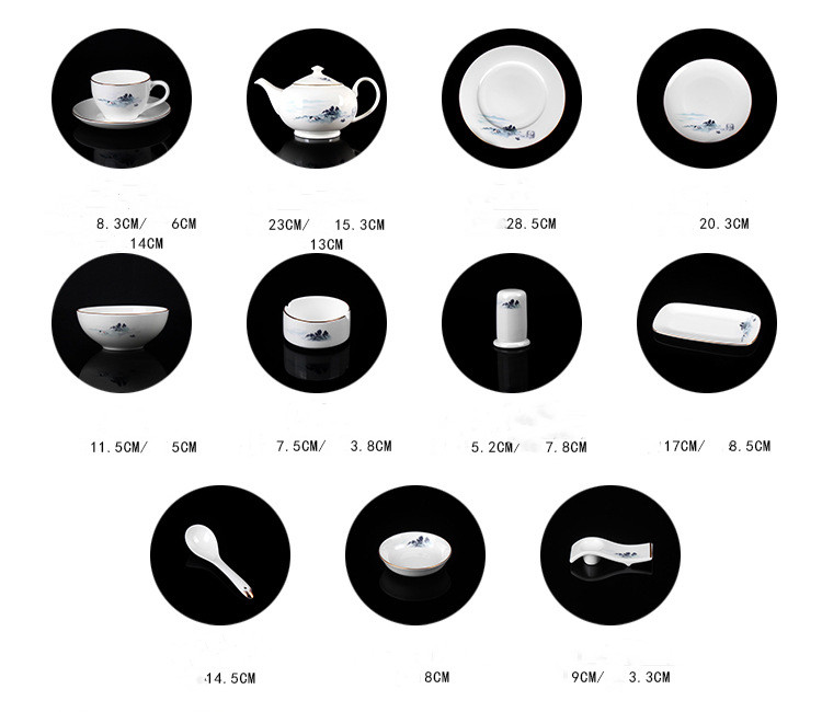 Color: European-style cup and saucer, 11-inch wide-sided flat plate, 8-inch shallow plate, 4.5-inch European-style bowl, teapot, 3-inch ashtray, 3-inch saucer, Chanel spoon, Chanel towel dish, summit chopstick holder, toothpick holder