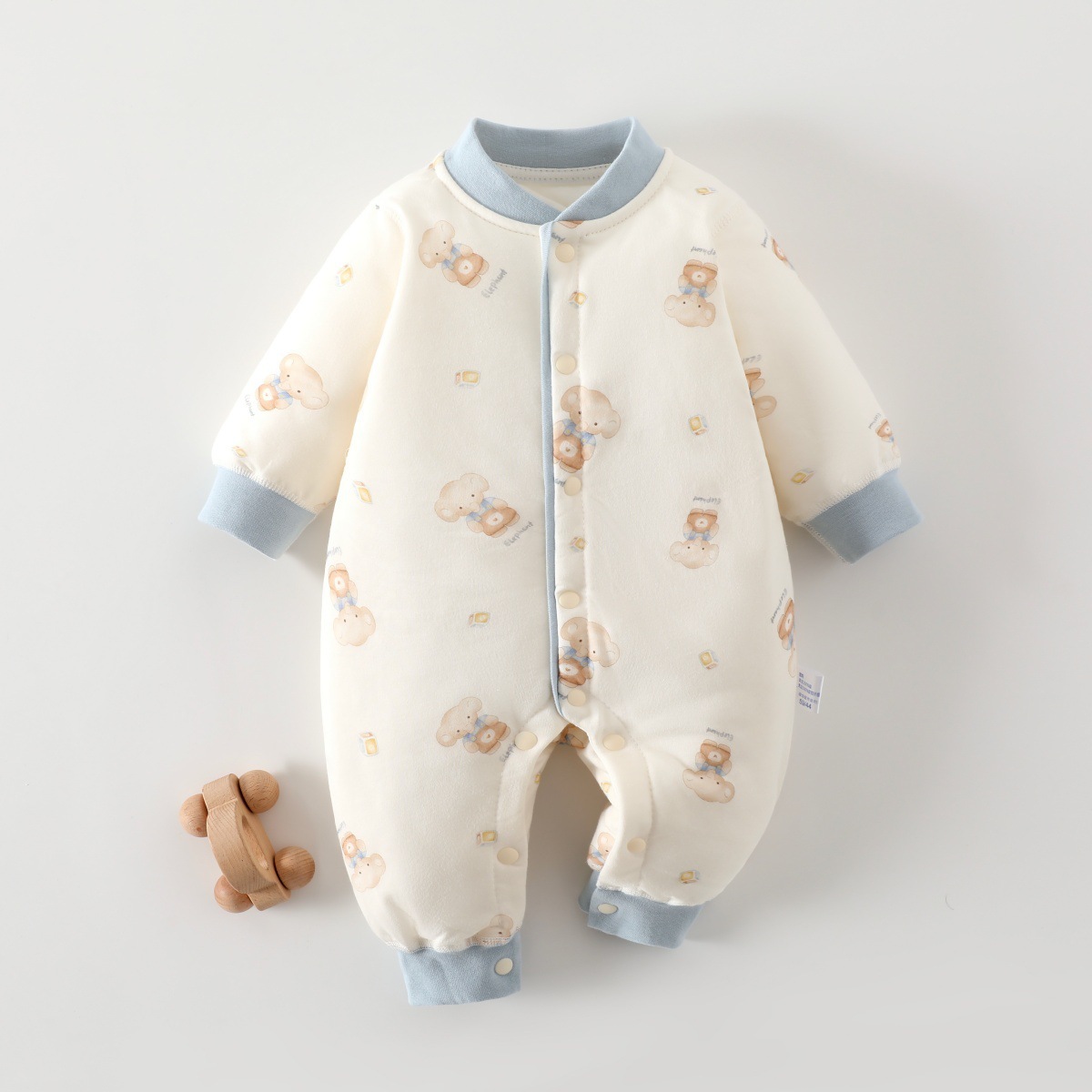 Colors: Blue overalls with a little elephant [60g quilted onesie], Green hugging bear [60g quilted onesie], Pink bow-tied bunny [60g quilted onesie], Yellow mushroom and fawn [60g quilted onesie]