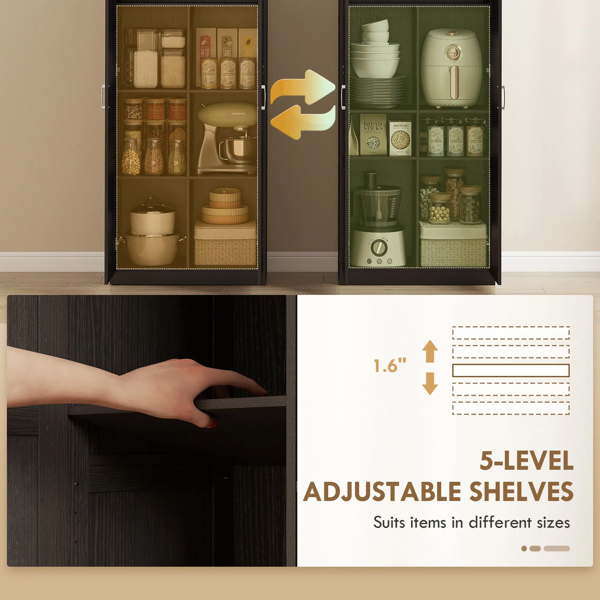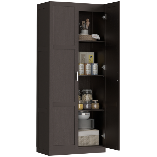 Features: - Vertical kitchen pantry cabinet maximises storage efficiently - Seven compartments organize food cookware and supplies for calmer kitchens - Four 5-level adjustable shelves adapt storage for tall bottles appliances - Soft-close hinges keep doors quiet and family friendly - Solid color finish with framed doors suits modern farmhouse interiors - Plywood frame is lighter and stronger than particleboard. Melamine surface is easy to wipe clean - Anti-tipping straps add stability for everyday safe use - Assembly required Specification: - Color: Dark Brown - Material: Plywood - Overall Dimensions: 29.5" W x 15.7" D x 70.9" H - Cabinet Inner Size: 28.3" W x 15.2" D x 16.9" H (top compartment), 14.2" W x 15.2" D x 15.9" H (other compartments) - Weight Capacity: 22 lbs. (fixed shelf), 33 lbs. (adjustable shelf), 110 lbs. (overall)
