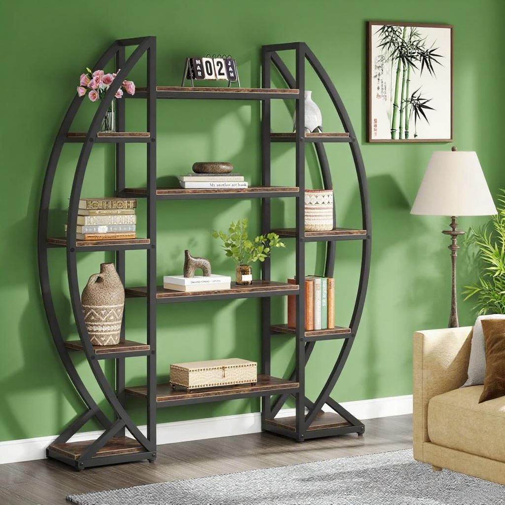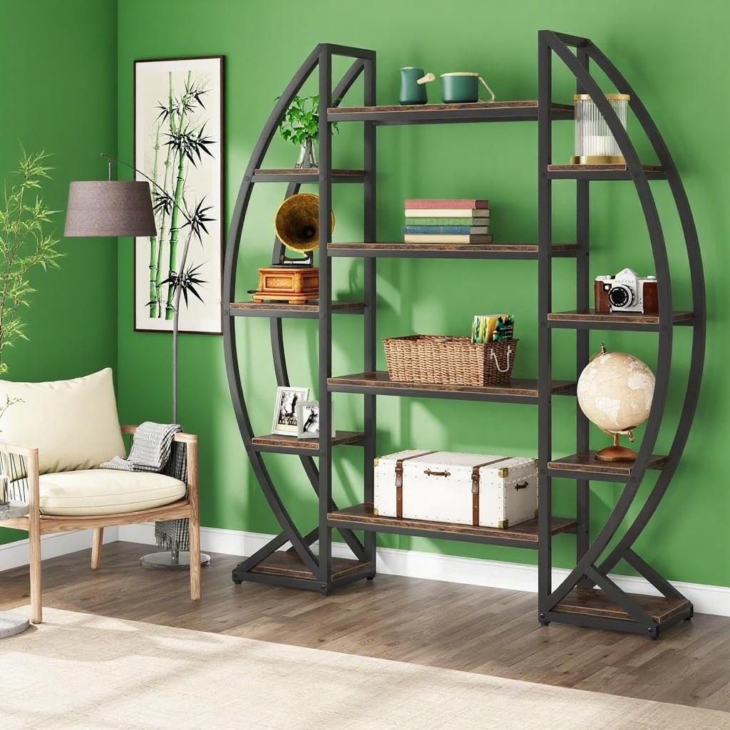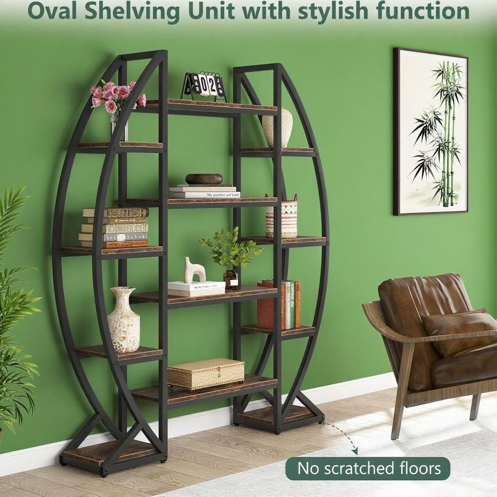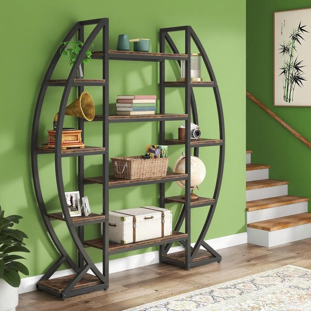 [Minimalist Oval Look]: This triple bookcase is designed with a black metal frame, rustic brown wooden tone 'oval' shaped shelf. The center shelves are suitable for books and pictures while smaller objets d'art will have pride of place on the left and right shelves.