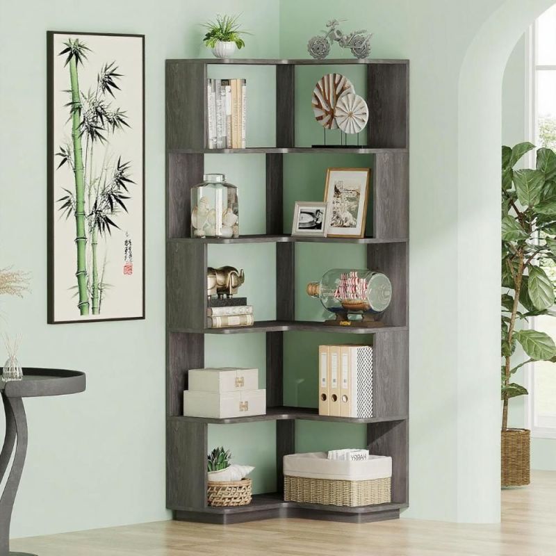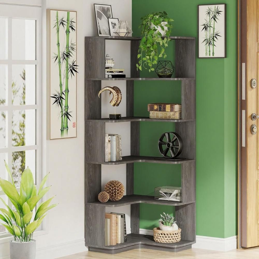 ������������ & ����������-��������������������: This industrial corner bookshelf features 6 open tiers with a sleek 90° right-angle design, blending seamlessly into any decor. Use as a bookshelf, display shelf, or storage rack in living rooms, bedrooms, hallways, or offices