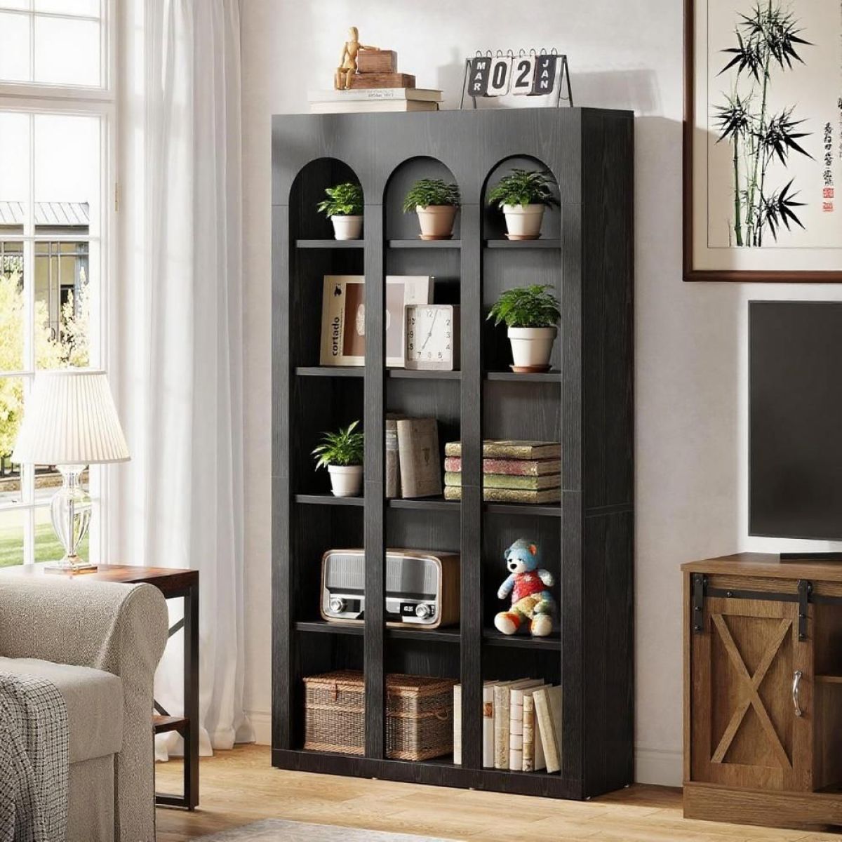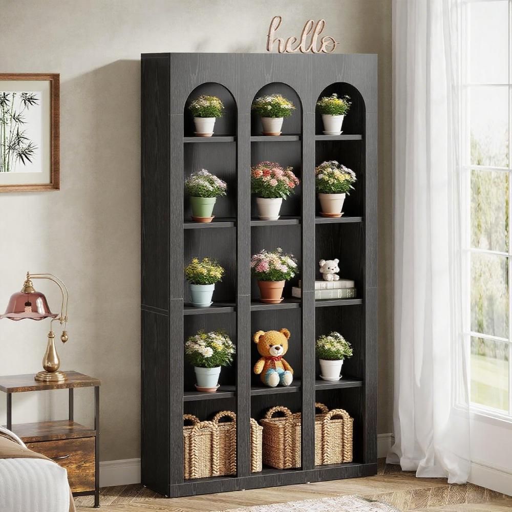 ���������������� �������������� ������������: Transform your space with the rustic farmhouse bookshelf that features a vintage black wood grain and arched detailing. It blends timeless charm with practical storage, adding a touch of mystery and elegance to any room