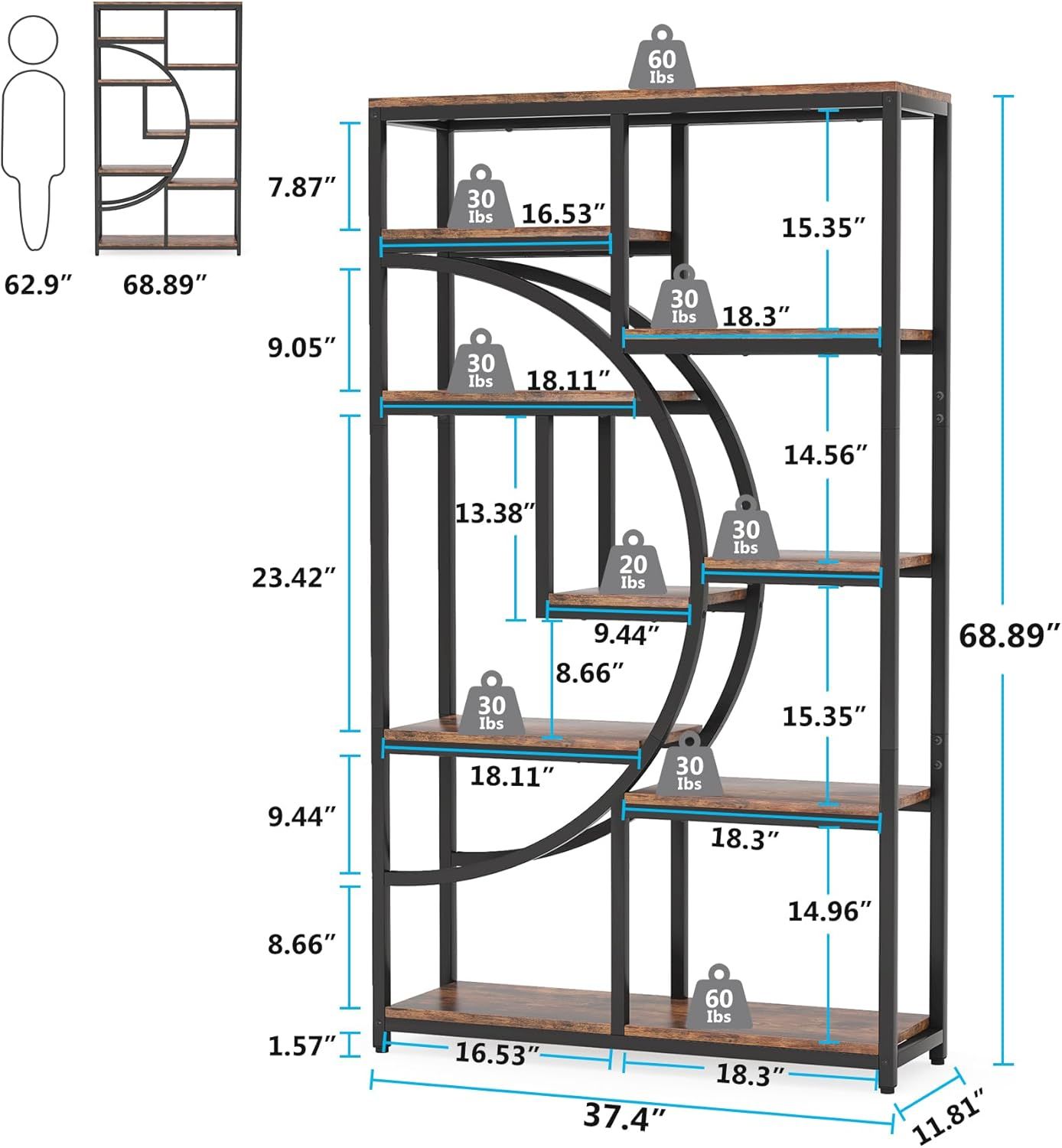 Elegant Geometric Design: Crafted with a black metal frame and rustic brown board, this bookcase, with its half-moon silhouette design, brings sophisticated flair to your favorite aesthetic. Fill the bookshelf with books, photos, plants, and decorations to make it an eye-catching addition to your home