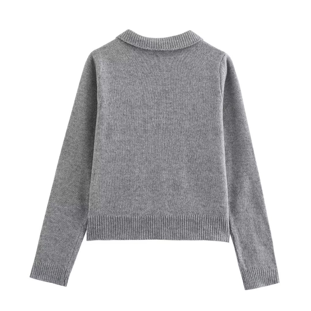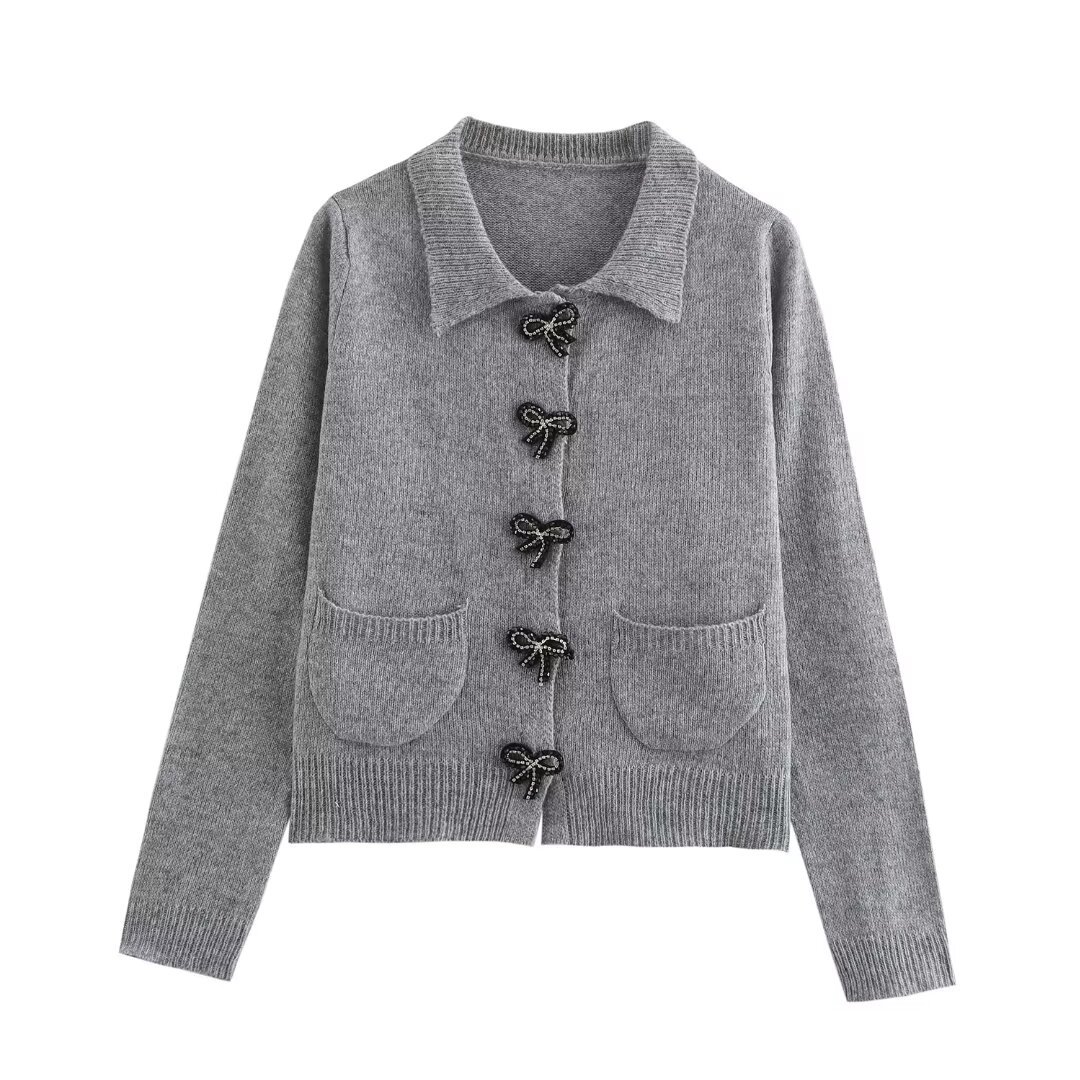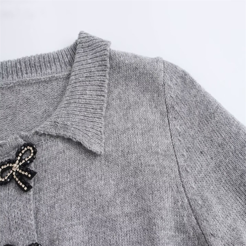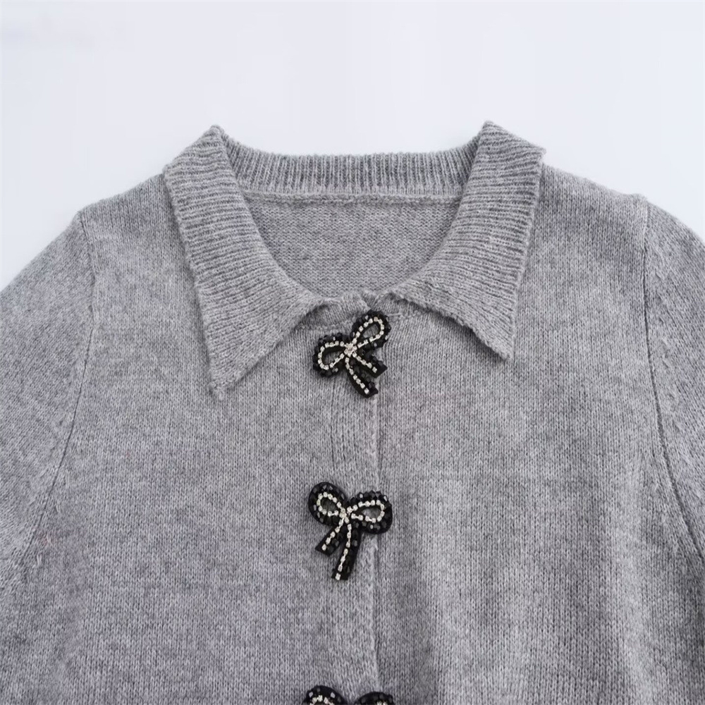 Bow Decorated Row Button Polo Collar Solid Color Short Long Sleeve Knitted Cardigan