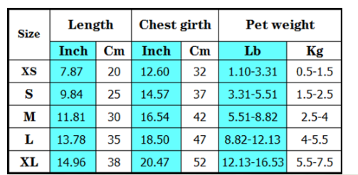 Sizes: XS (recommended weight: 1-4 kg),S (recommended weight: 4-6 kg),M (recommended weight: 6-10 kg),L (recommended weight: 10-14 kg),XL (recommended weight: 14-18 kg)