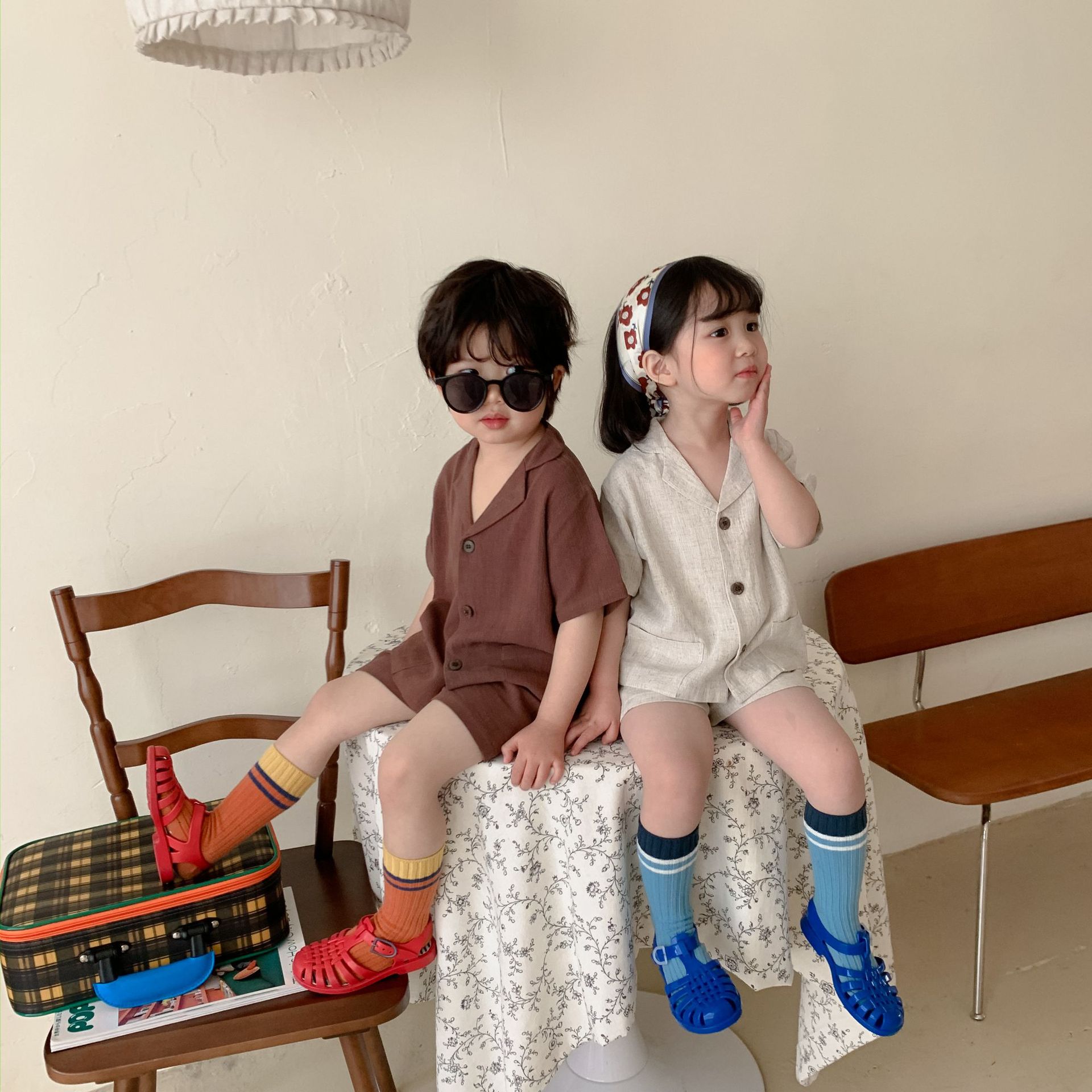 Color classification: original color linen top + pants, coffee color linen top + pants