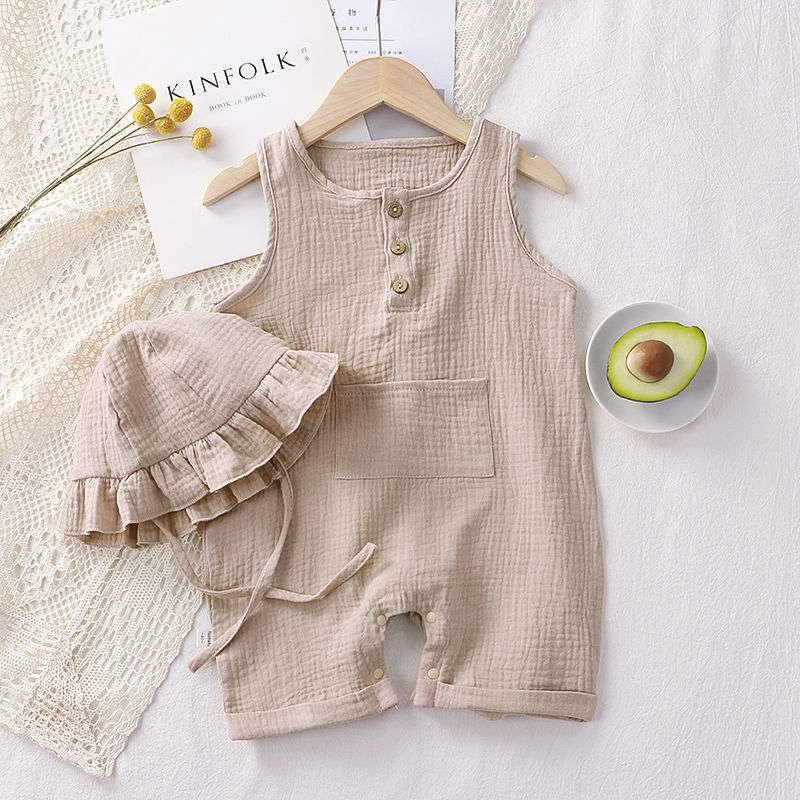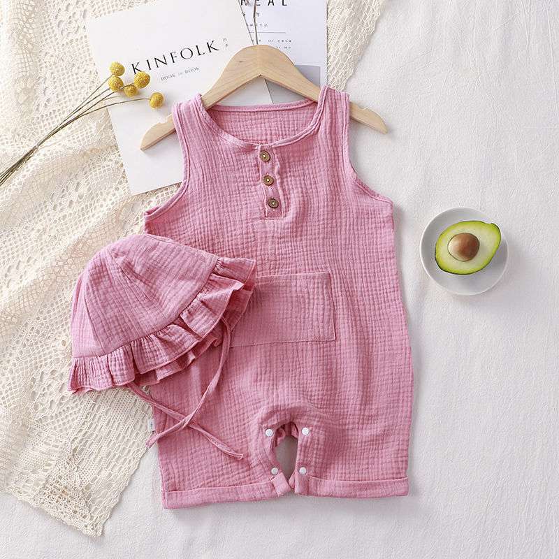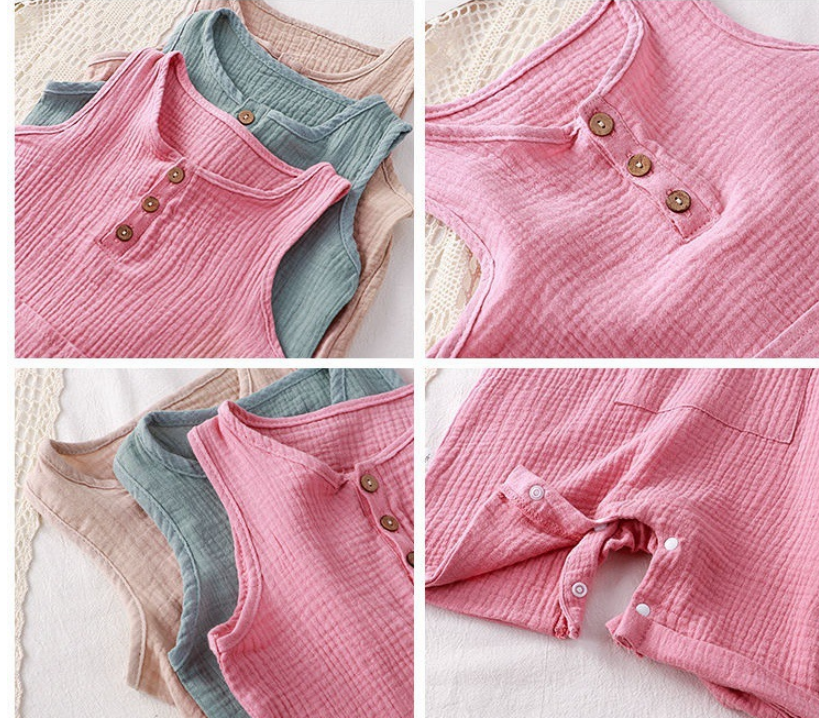 Color: pink vest gauze romper, wheat color vest gauze romper, light cyan vest gauze romper