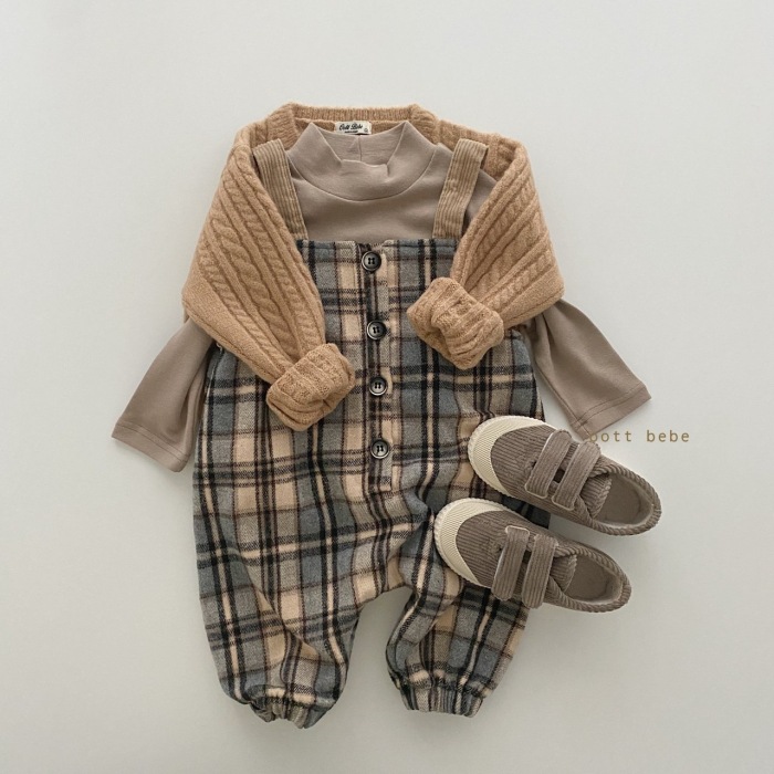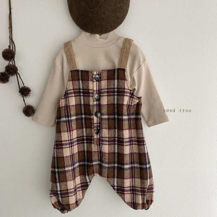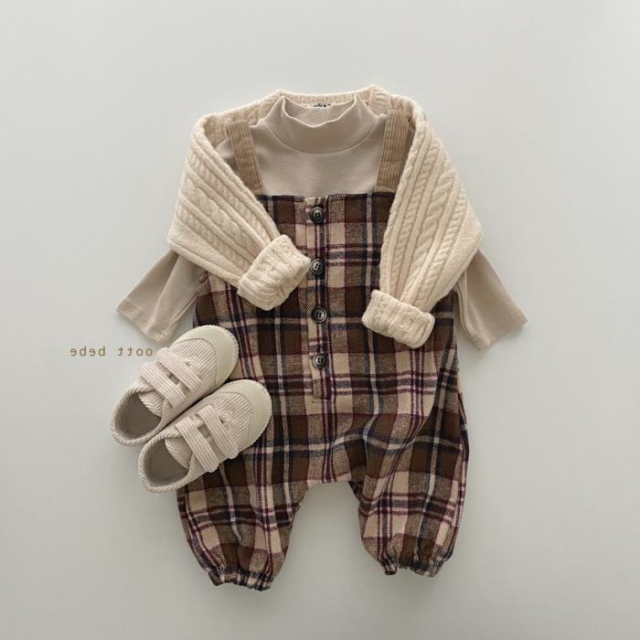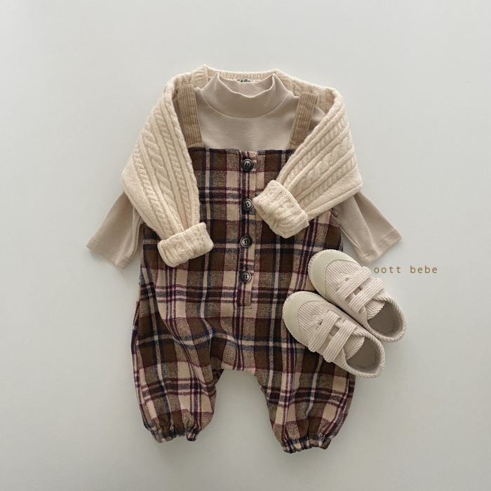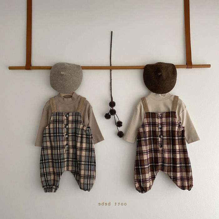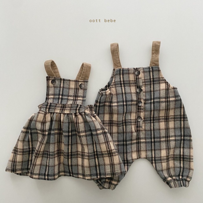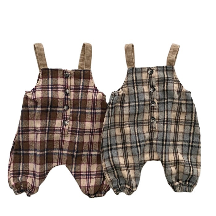Color: Beige plaid overalls, brown plaid overalls