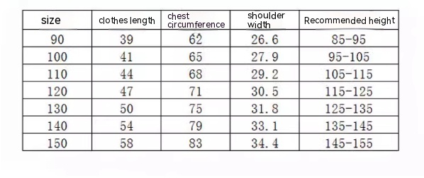 Reference height: 90 size [recommended height 85-95 centimeters], 100 size [recommended height 95-105 centimeters], 110 size [recommended height 105-115 centimeters], 120 size [recommended height 115-125 centimeters], 130 size [recommended height 125-135 centimeters], 140 size [recommended height 135-145 centimeters], 150 size [recommended height 145-155 centimeters]