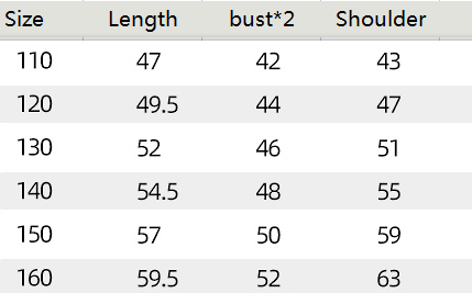 Reference height: 110 size recommended height is about 110cm 120 size recommended height is about 120cm model wear 130 size recommended height is about 130cm 140 size recommended height is about 140cm 150 size recommended height is about 150cm 160 size recommended height is about 160cm