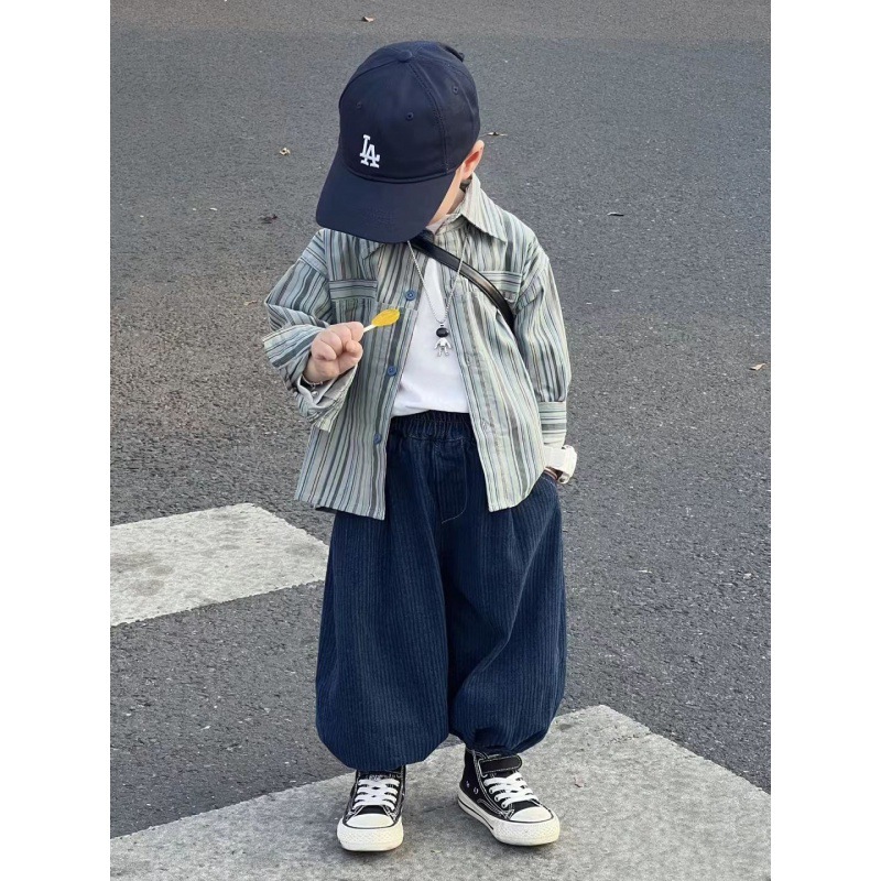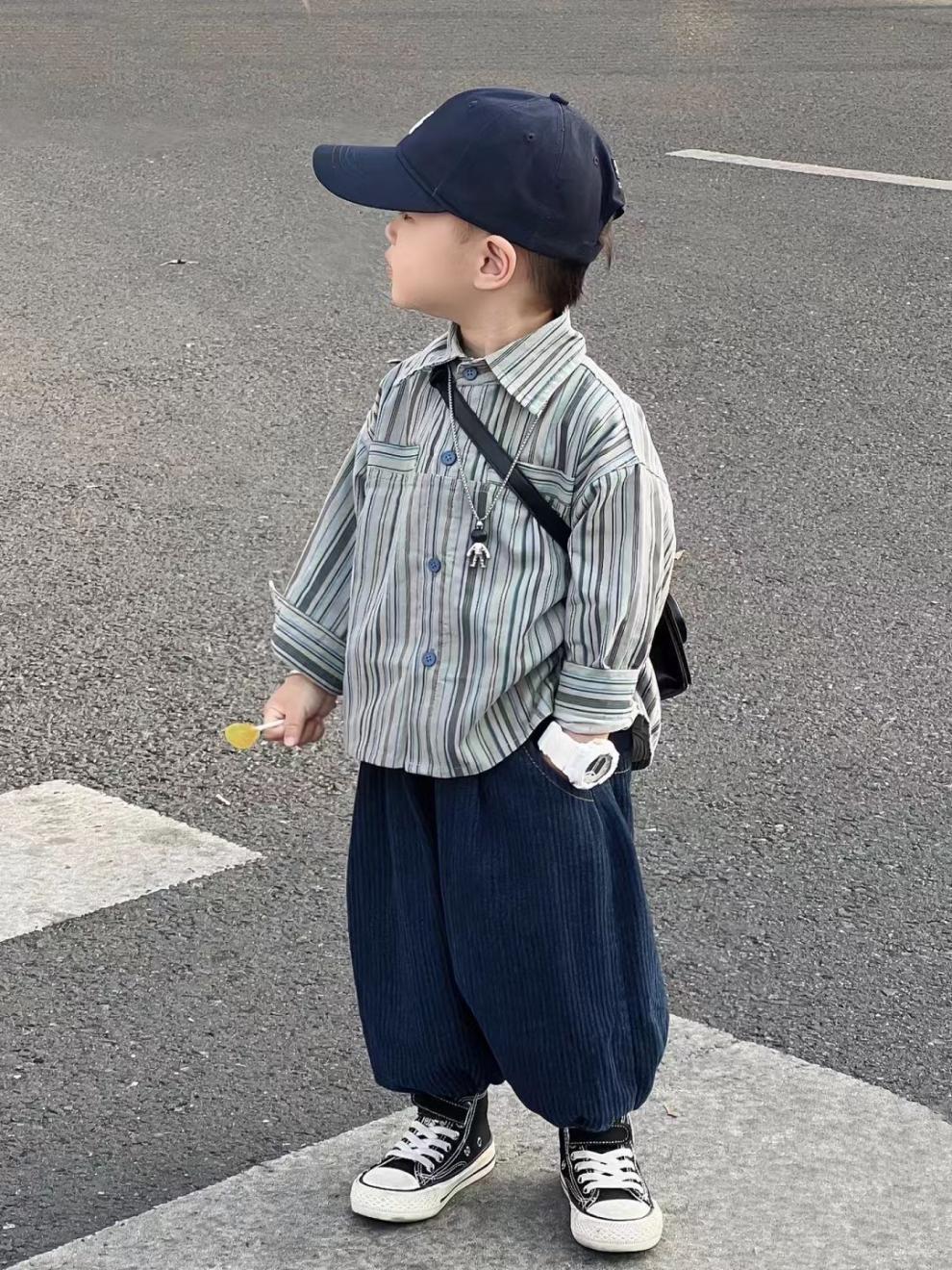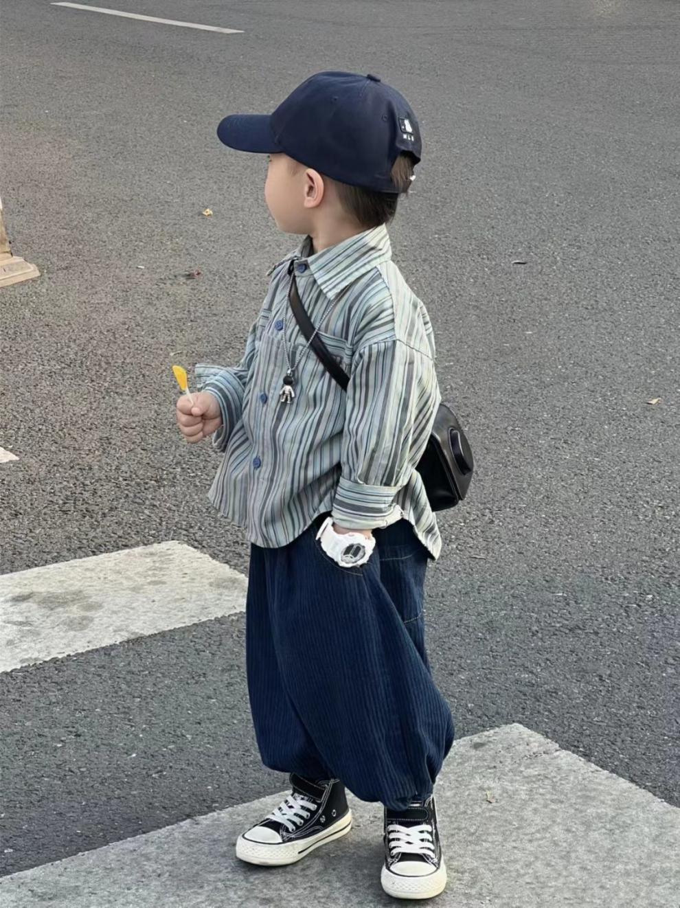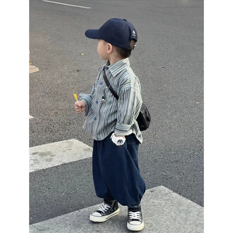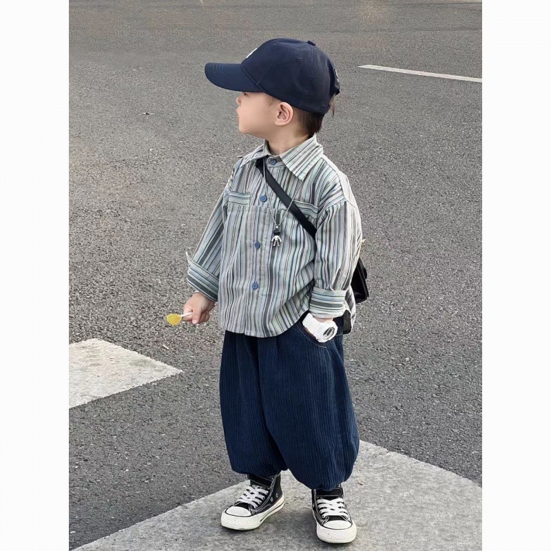 Color: blue two-piece suit, blue striped shirt, blue pants