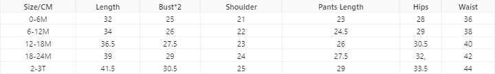 Specifications: 0-6M,6-12M,12-18M,18-24M,2-3T