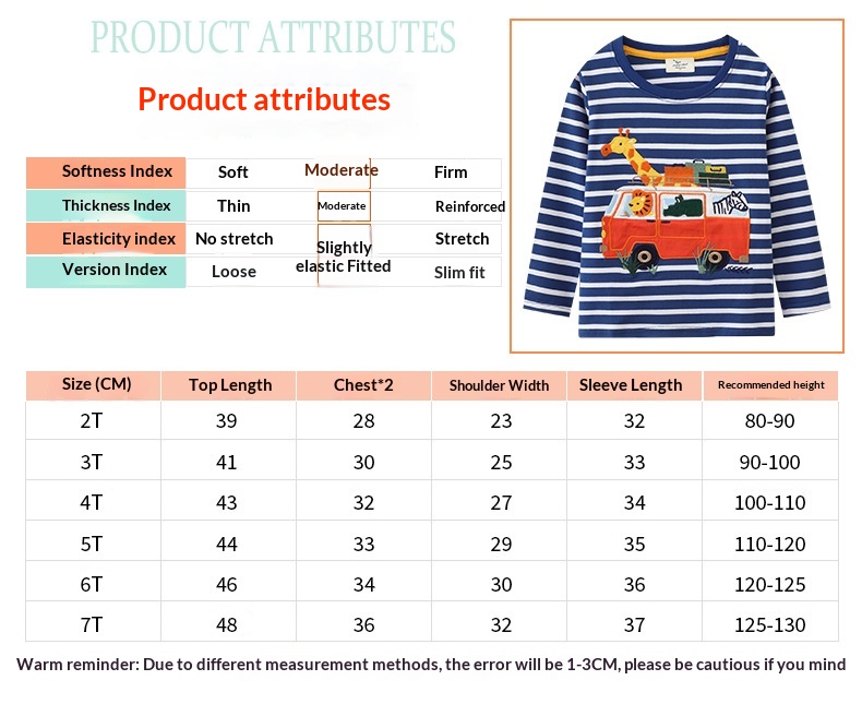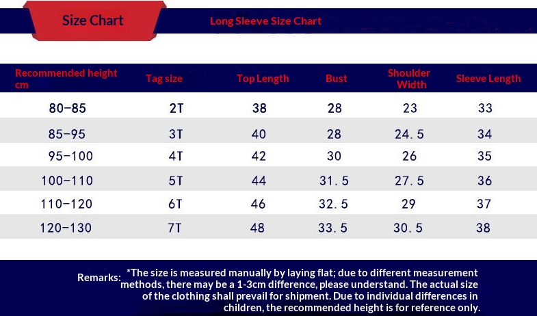 Suitable Height: 2T recommended for 80–85 cm, 3T for 85–90 cm, 4T for 90–100 cm, 5T for 100–110 cm, 6T for 110–120 cm, 7T for 120–130 cm
