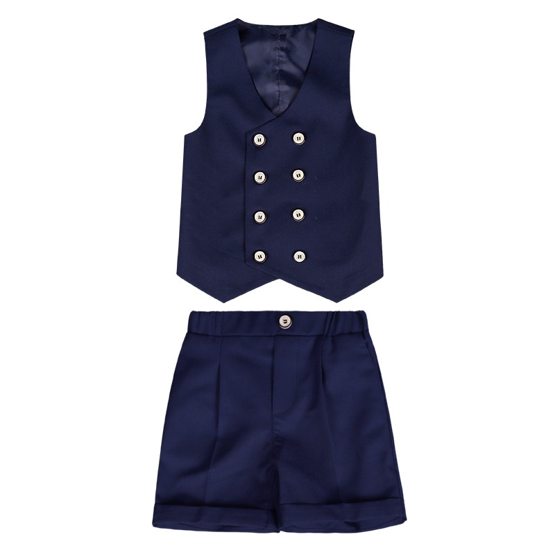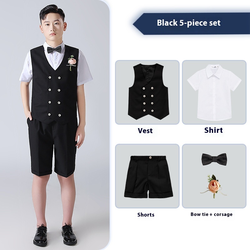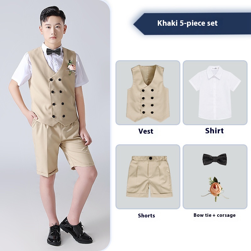 Color: navy blue four-piece set (vest shorts bow tie corsage), navy blue five-piece set (short sleeve vest shorts bow tie corsage), black four-piece set (vest shorts bow tie corsage), black five-piece set (short sleeve vest shorts bow tie corsage), khaki 4-piece set (vest shorts bow tie corsage), khaki 5-piece set (short sleeve vest shorts bow tie corsage)