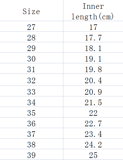 Size: 27, 28, 29, 30, 31, 32, 33, 34, 35, 36, 37, 38, 39