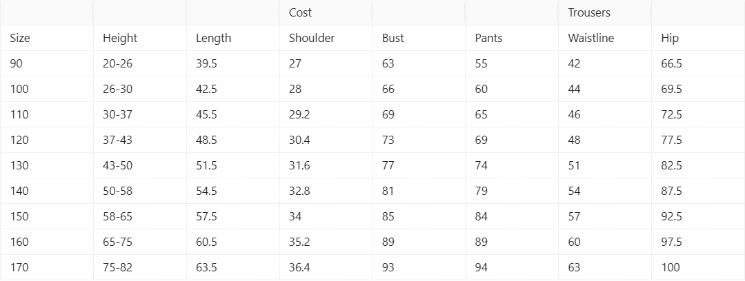Suitable height: it is recommended to buy a larger size for a small size, 110 size recommended height 100cm,120 size recommended height 110cm,130 size recommended height 120cm,140 size recommended height 130cm,150 size recommended height 140cm,160 size recommended height 150cm