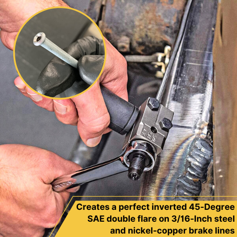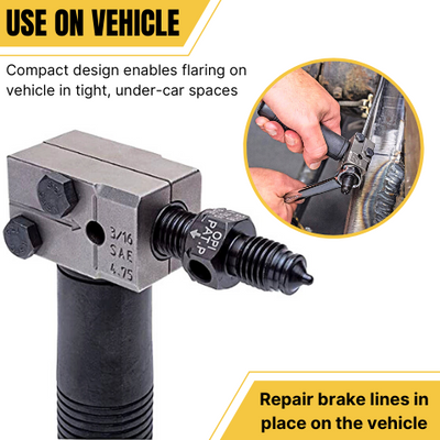 EASY TO USE: Has a compact design that enables flaring on the vehicle in tight, under-car spaces. No need to go through the tedious process of removing your vehicle's brake line. The handle can also be removed from the brake flaring tool if you prefer to use it in a bench vise.