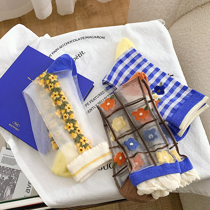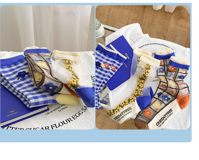 Color: a pair of blue orange and yellow flowers, a pair of blue plaid flowers, and a pair of vertical broken flowers.