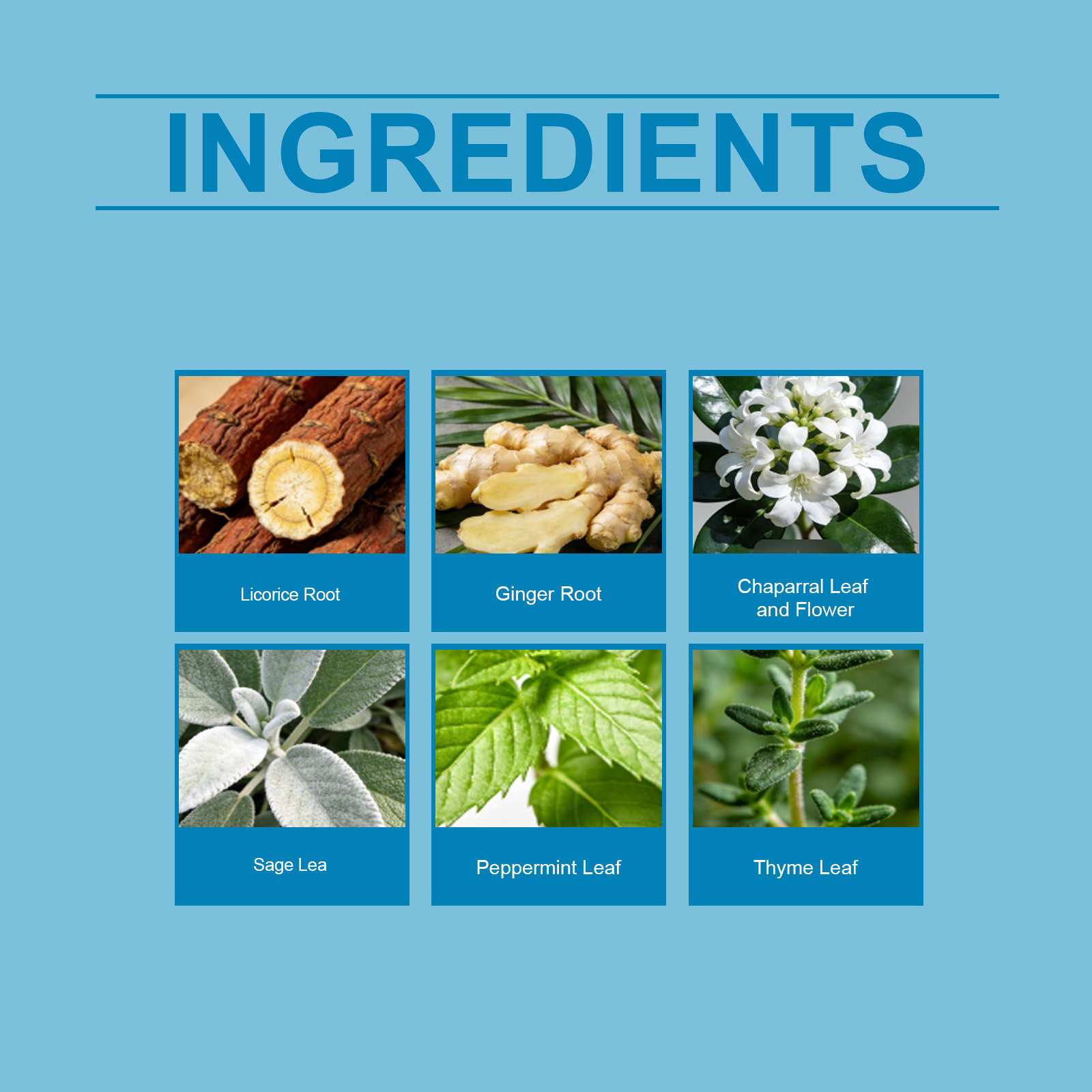 Ingredients: licorice root, ginger root, Chaparral leaves and flowers, sage leaves, mint leaves and thyme leaves.