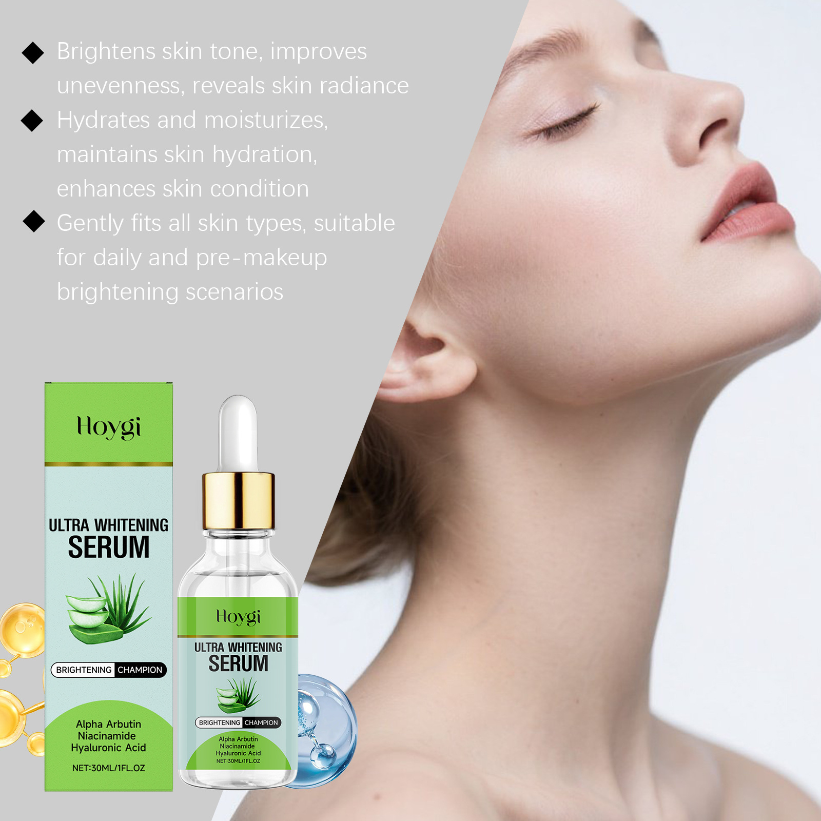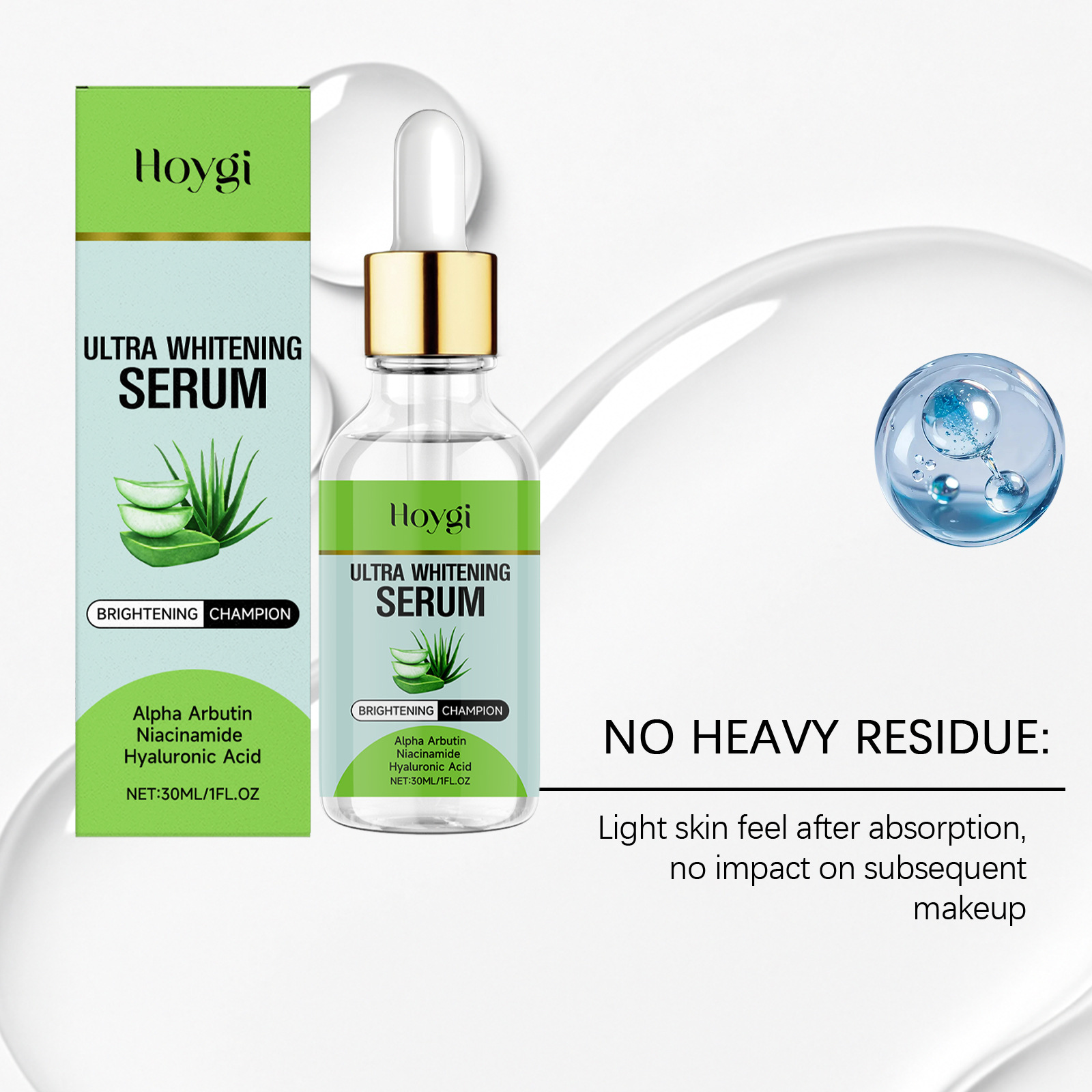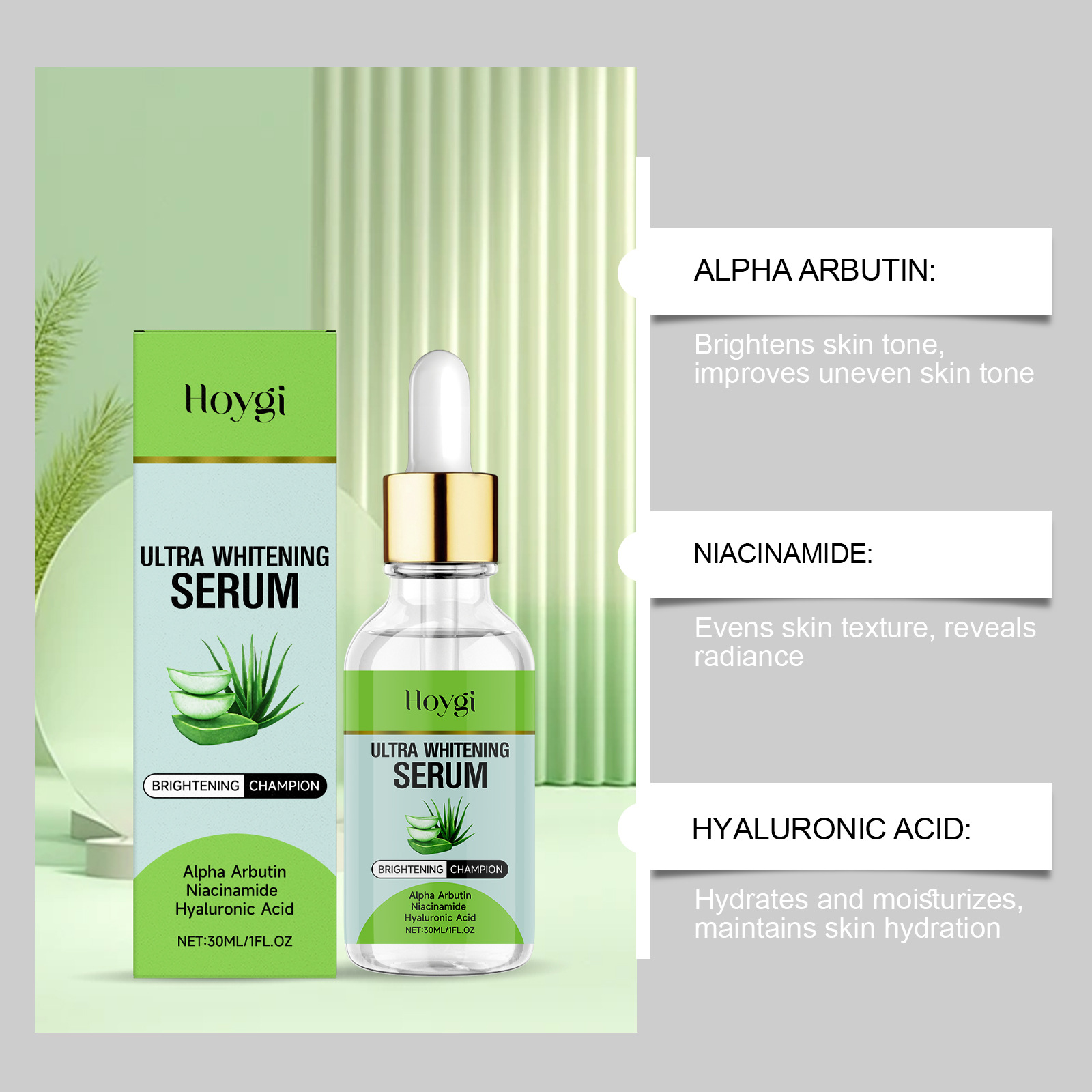 Ingredients: water, glycerin, 1,2- hexanediol, carbomer, arginine, allantoin, α-arbutin, nicotinamide, hyaluronic acid, aloe vera extract.