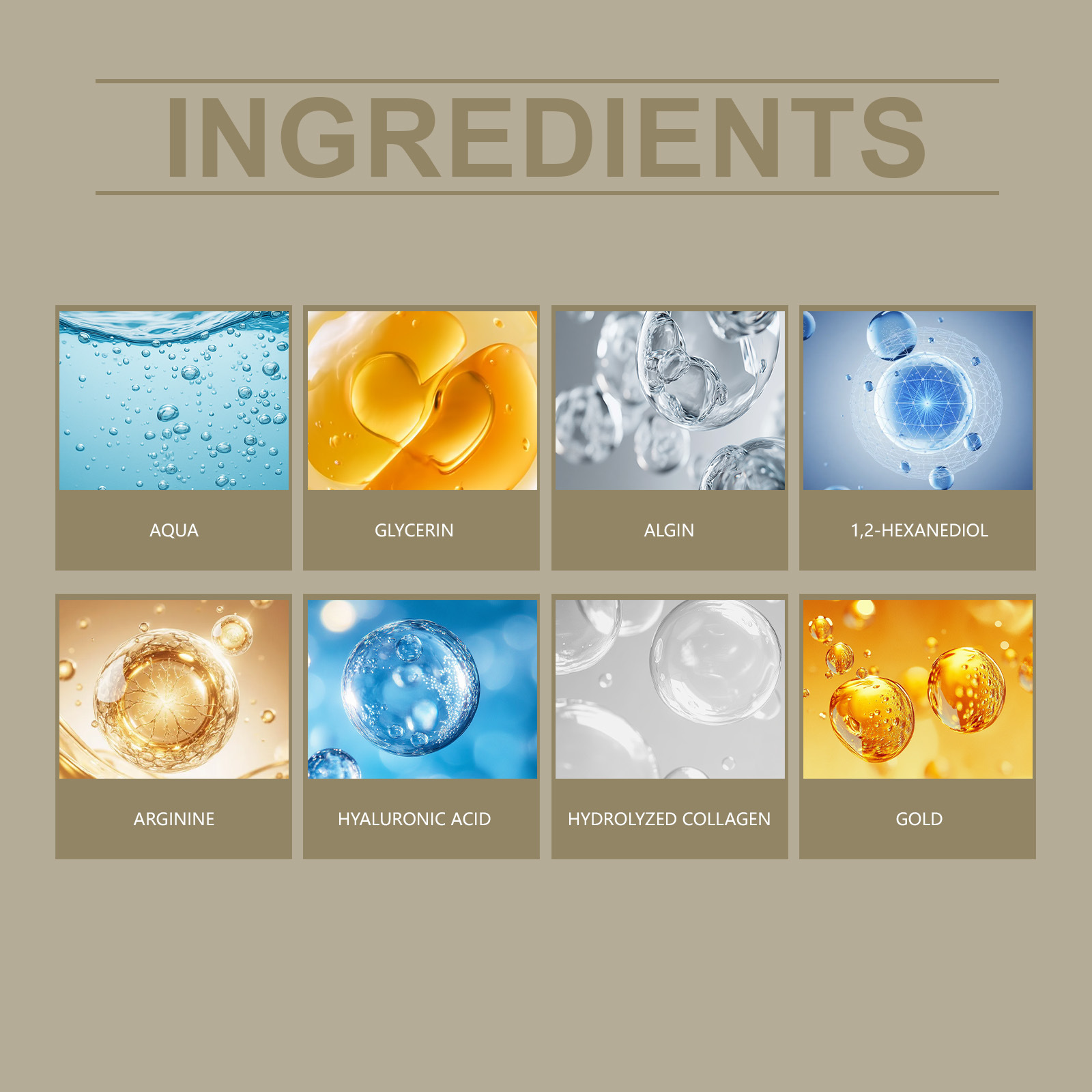 Ingredients: water, glycerin, sodium alginate, 1,2-hexanediol, arginine, hyaluronic acid, hydrolyzed collagen, gold.