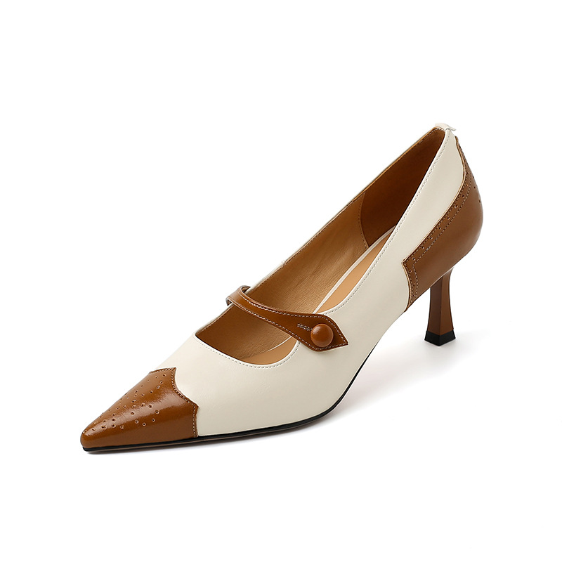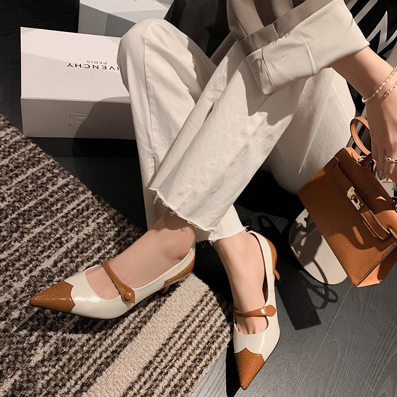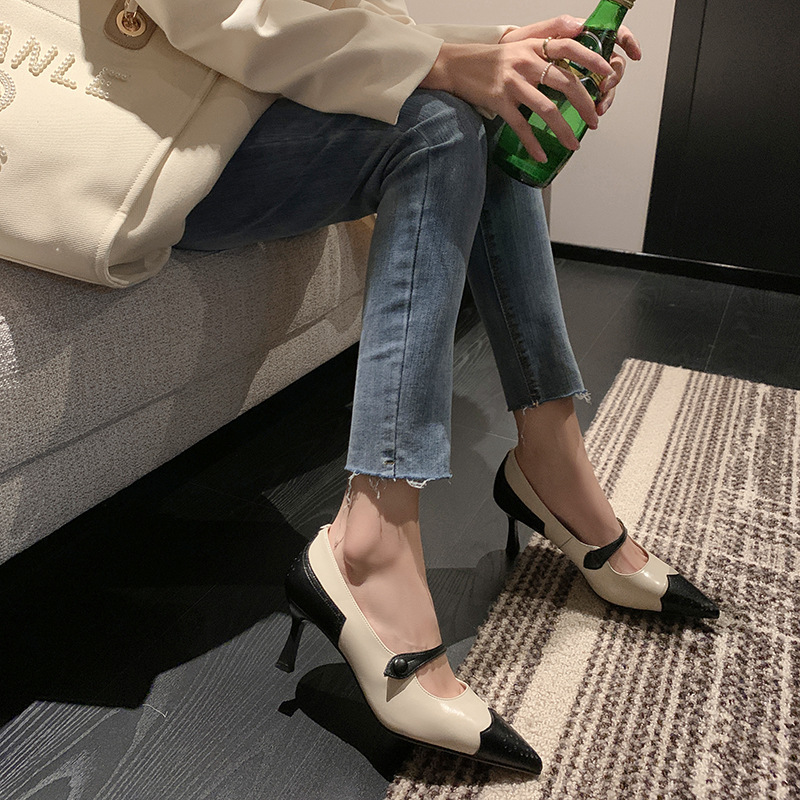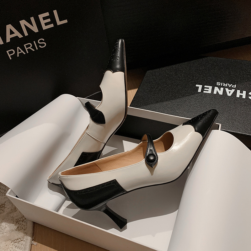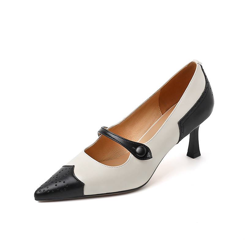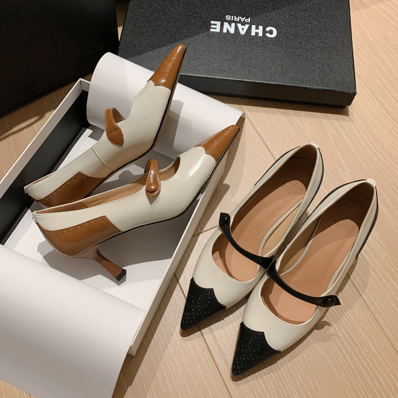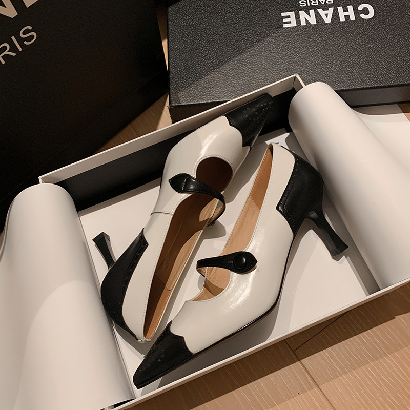 British Retro Color Blocking Full Leather Fine High Heel Mary Jane Shoes