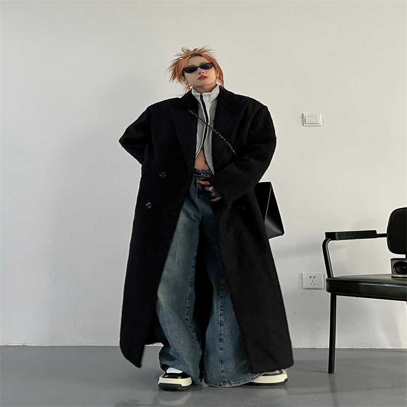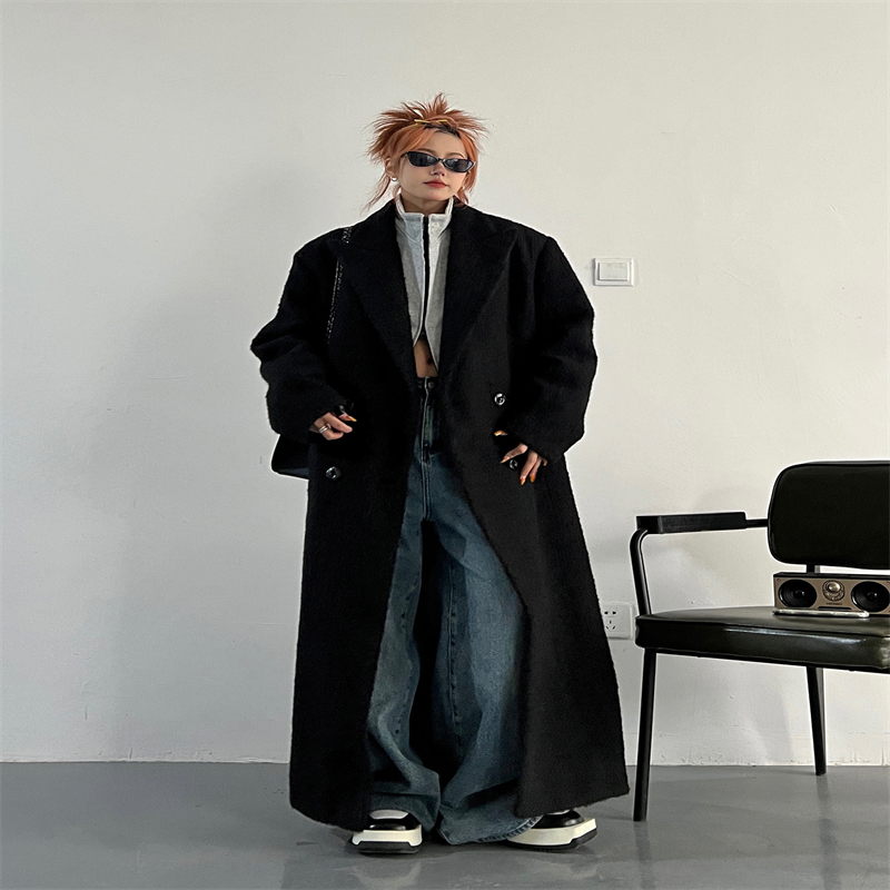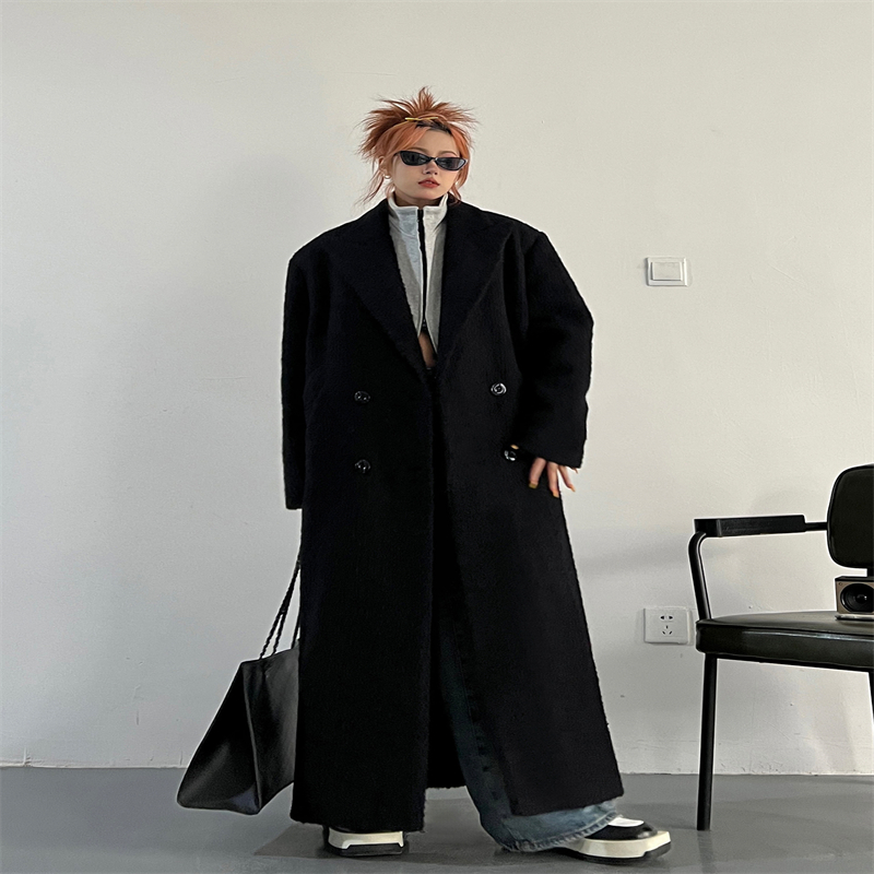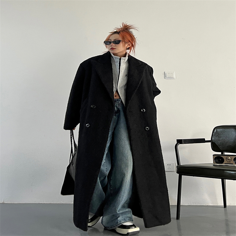 British Style Thick Black Loose Extended Velvet Woolen Coat
