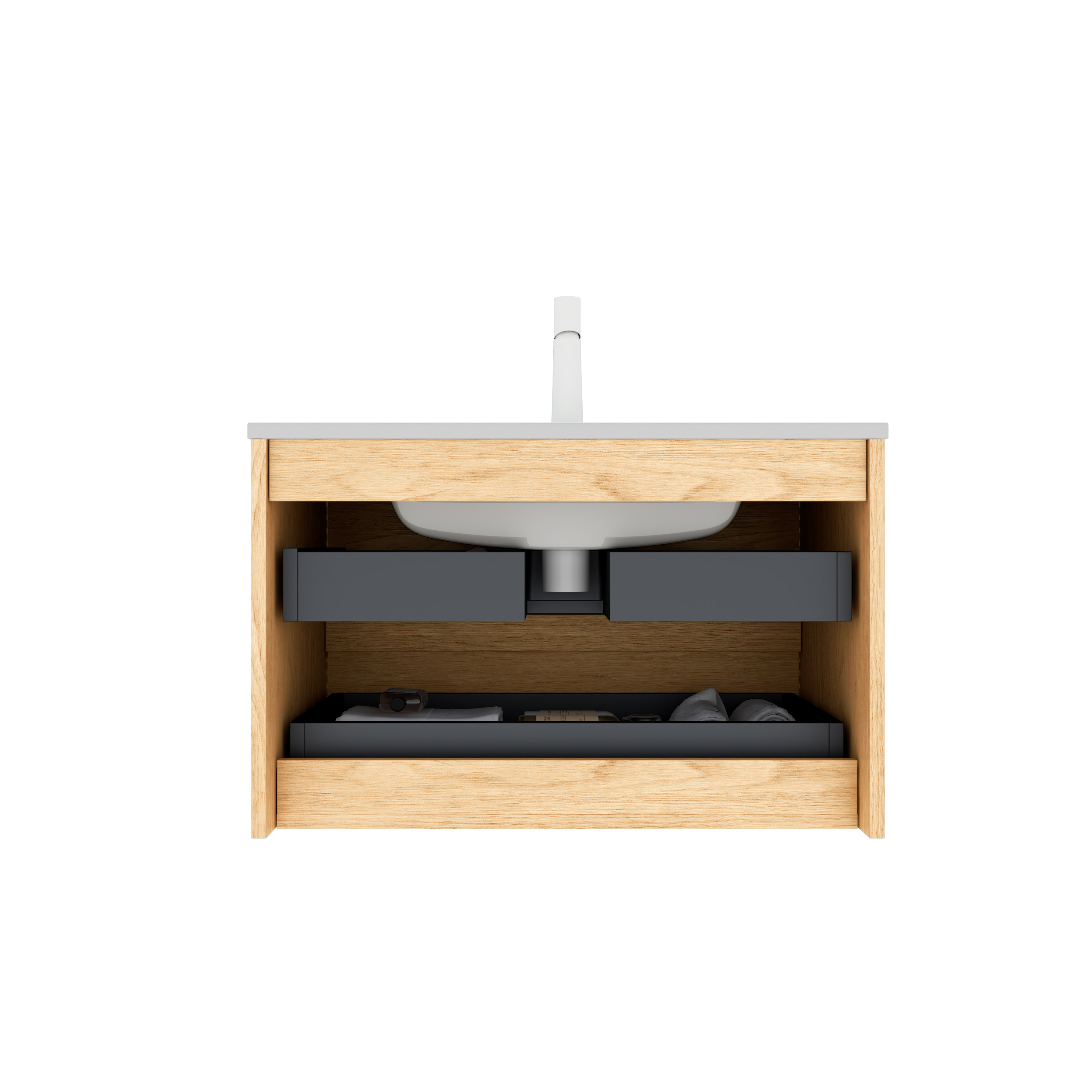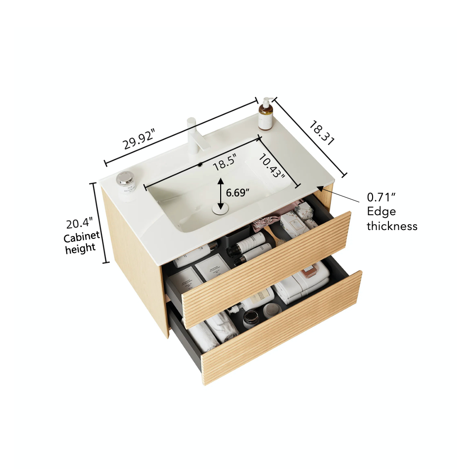 BRON 30 Bathroom Vanity With Sink, Wall-Mounted Floating Plywood Bathroom Storage Cabinet With Drawers, White Ceramic Basin, Pre-assembled, Corolla Oak Woodgrain Color