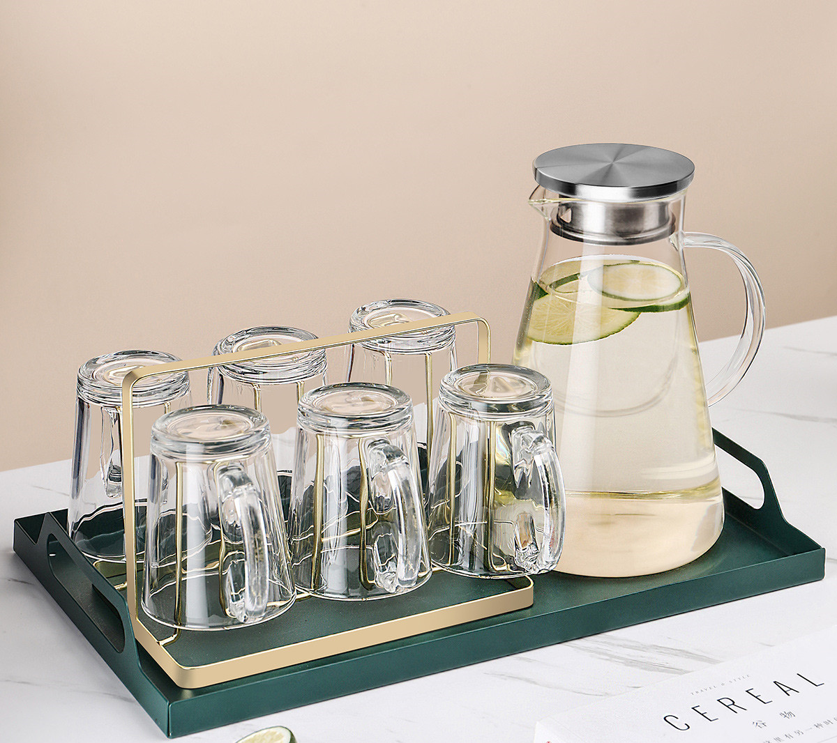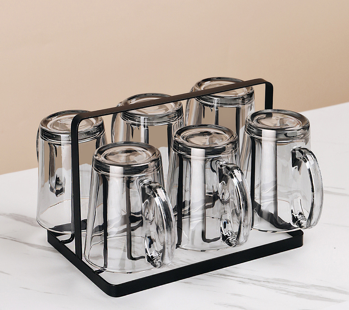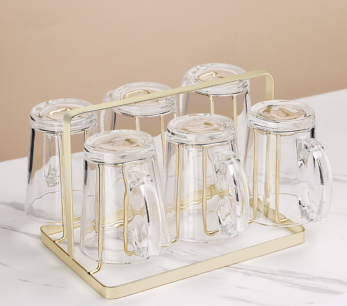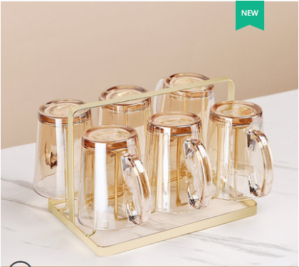 U:Six transparent handle cups + golden cup holder + transparent triangular pot + green iron tray