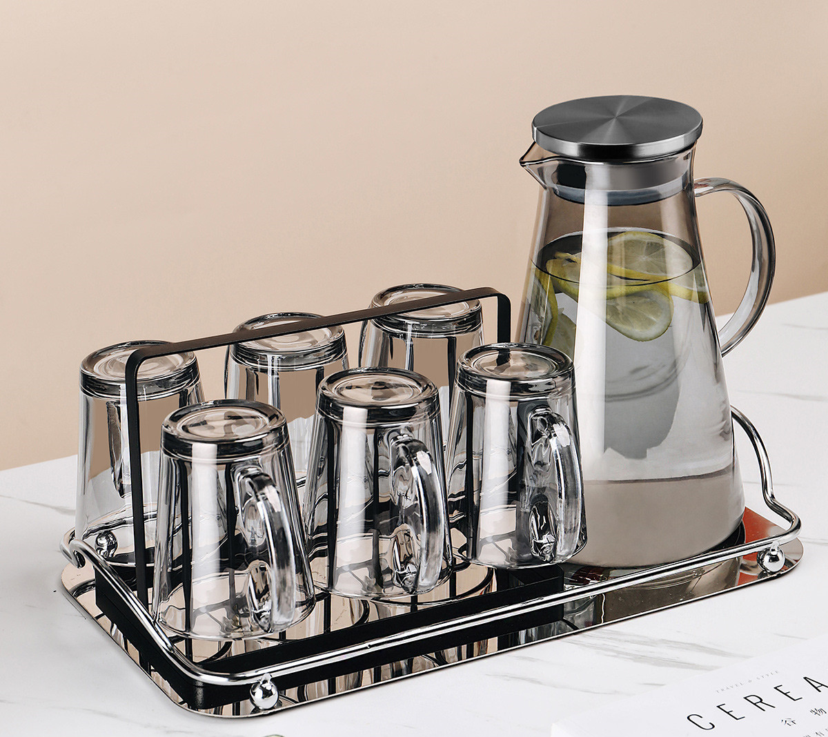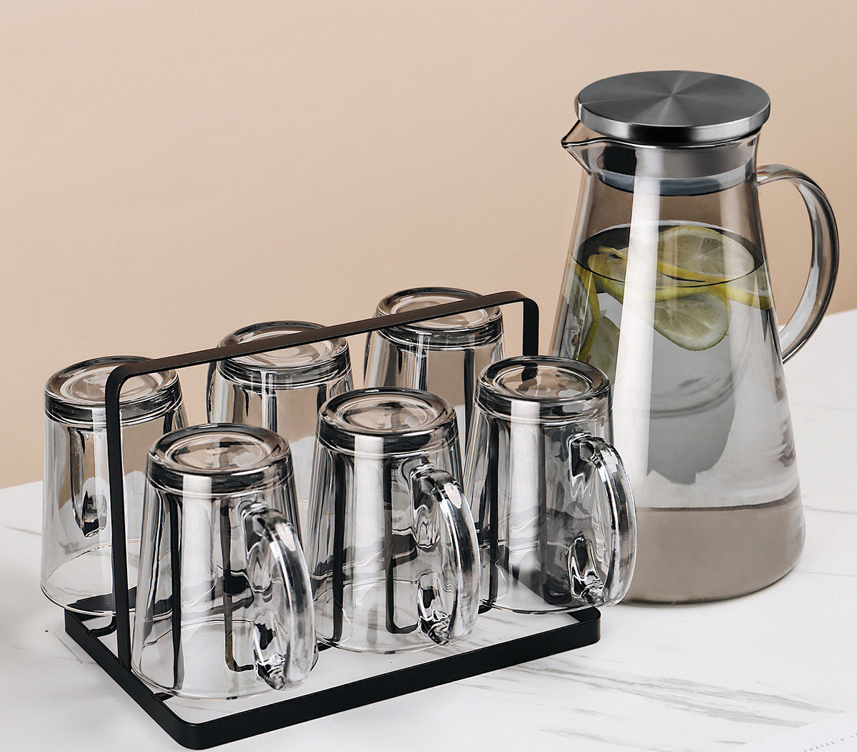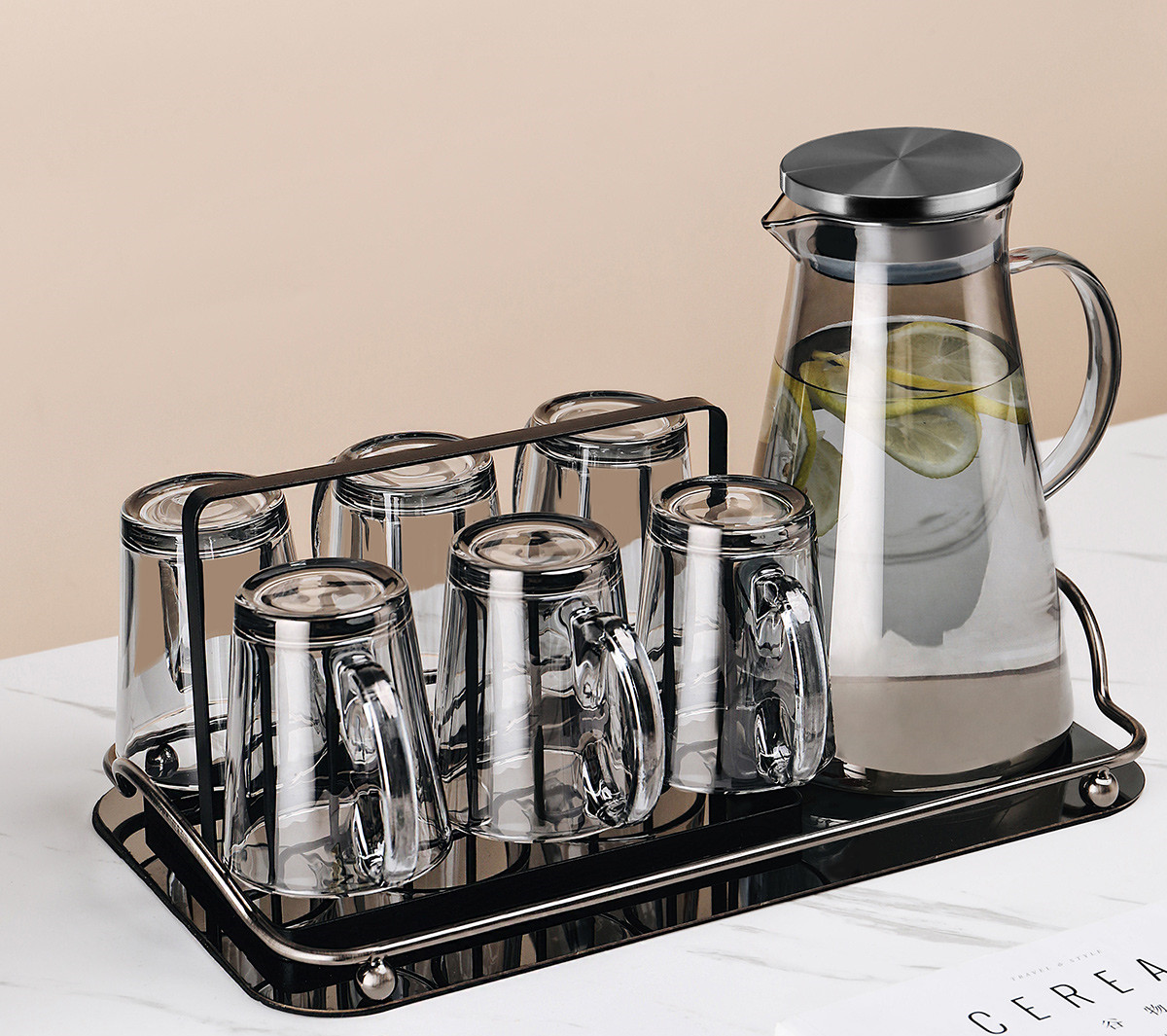 U:Six transparent handle cups + golden cup holder + transparent triangular pot + green iron tray