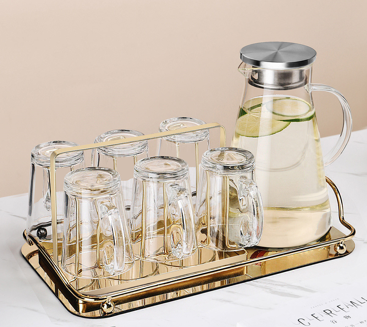 R:Six transparent handle cups + golden cup holder + transparent triangular pot + golden mirror tray
