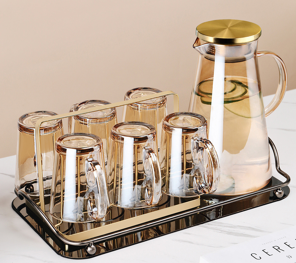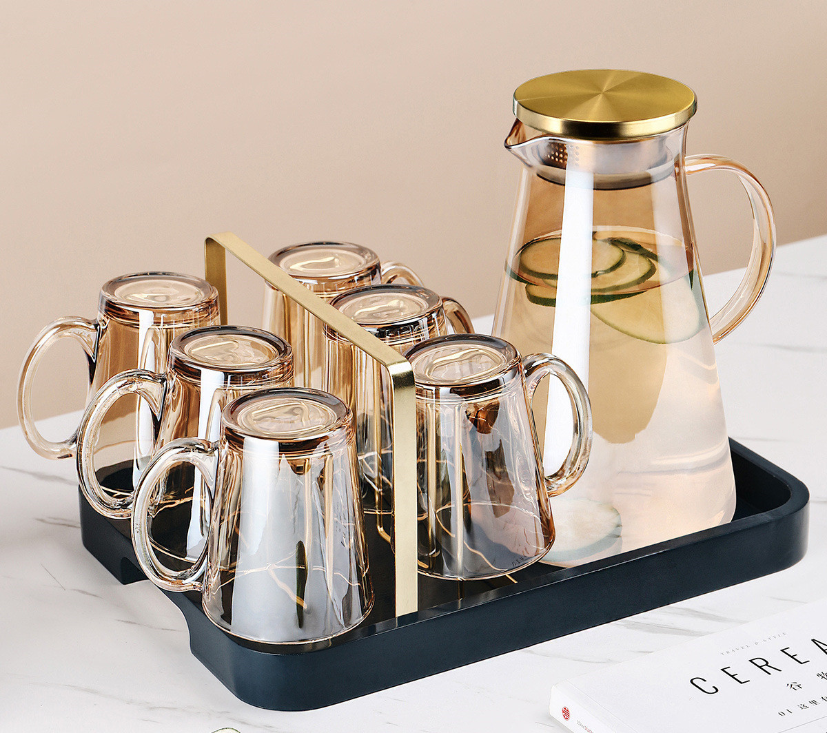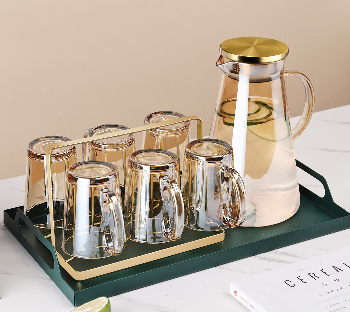 S:[Recommended by the shopkeeper] Six amber handle cups + gold cup holder + amber triangle pot + green iron tray