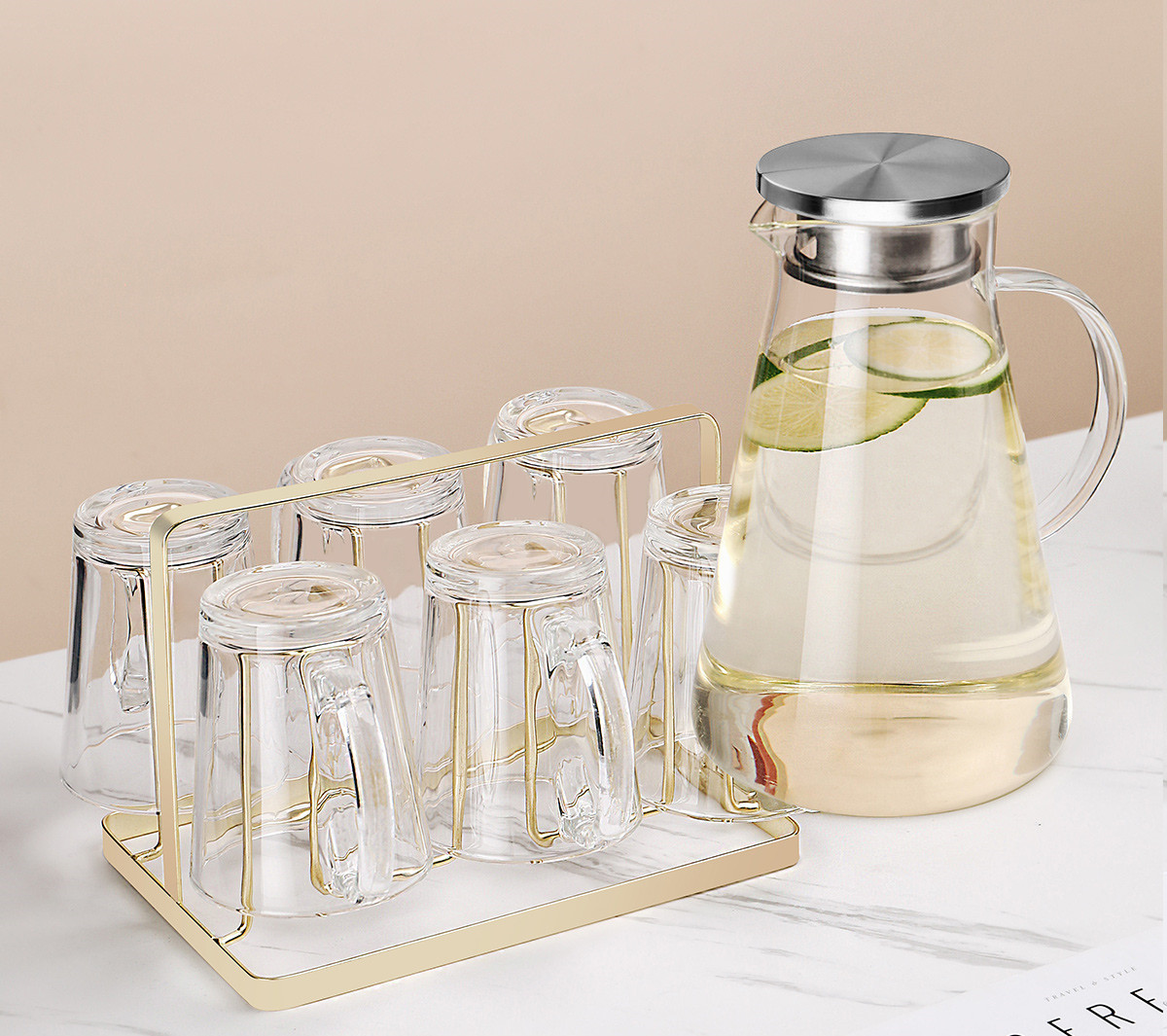 L:Six transparent handle cups + golden cup holder + transparent triangular pot