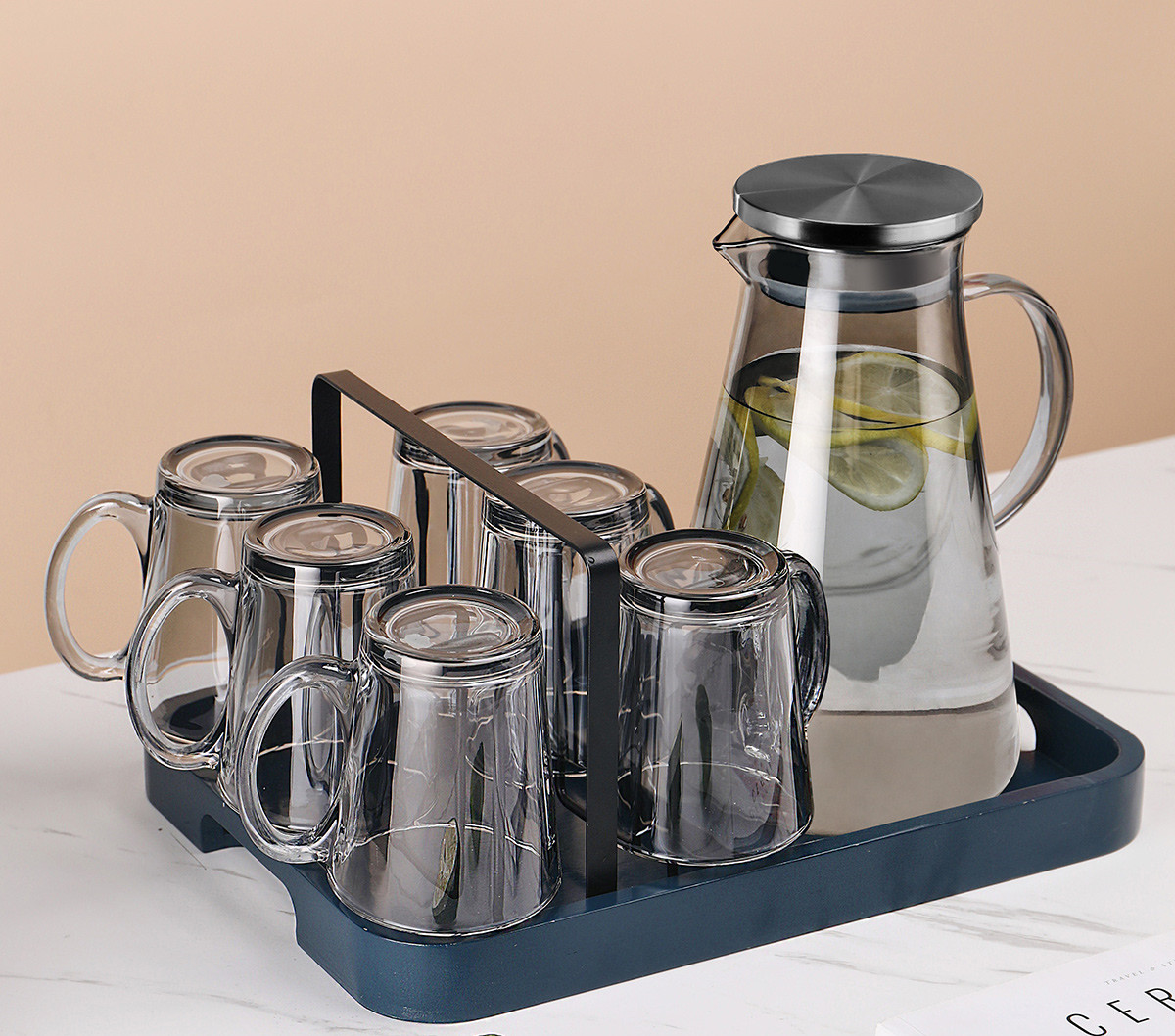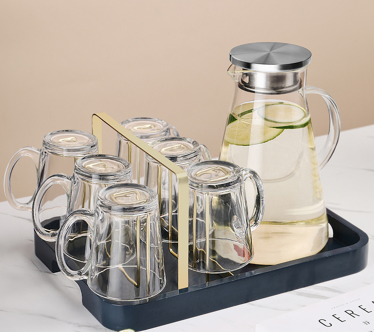 X:Six transparent handle cups + golden cup holder + transparent triangular pot + blue bamboo wooden tray