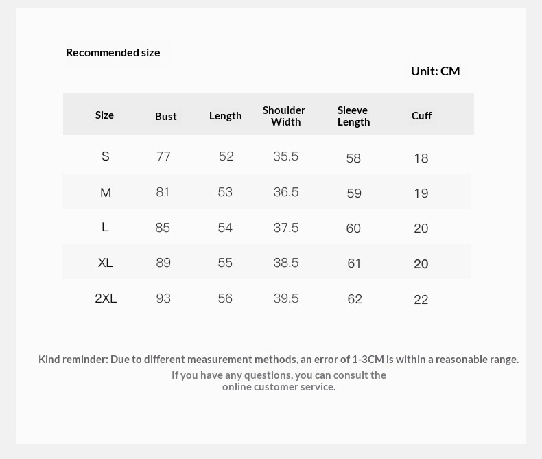 1. Asian sizes are 1 to 2 sizes smaller than European and American people. Choose the larger size if your size between two sizes. Please allow 2-3cm differences due to manual measurement. 2. Please check the size chart carefully before you buy the item, if you don't know how to choose size, please contact our customer service. 3.As you know, the different computers display colors differently, the color of the actual item may vary slightly from the following images.