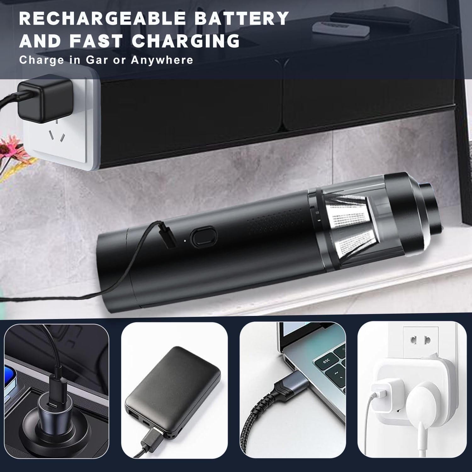 4.【Vacuum cleaner with rechargeable battery and fast charging】Handheld cordless vacuum cleaner with 2000mAh battery and fast charging Type-C interface. With a 5V/1A adapter, it can be fully charged quickly and easily anywhere in the car or home. This rechargeable vacuum cleaner is the perfect alternative to compressed air machines, environmentally friendly and energy efficient, which also greatly saves money and time.