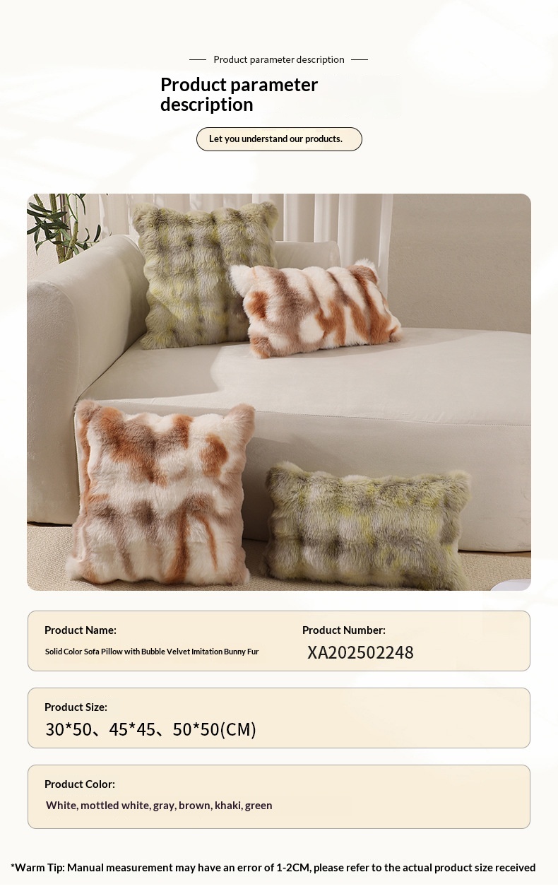 Dimensions: 30*50cm (without insert), 45*45cm (without insert), 30*50cm (with 350g non-woven fabric insert), 30*50cm (with 380g high-resilience foam insert), 30*50cm (with 600g feather-down blend insert), 45*45cm (with 400g non-woven fabric insert), 45*45cm (with 500g high-resilience foam insert), 45*45cm (with 750g feather-down blend pillow)