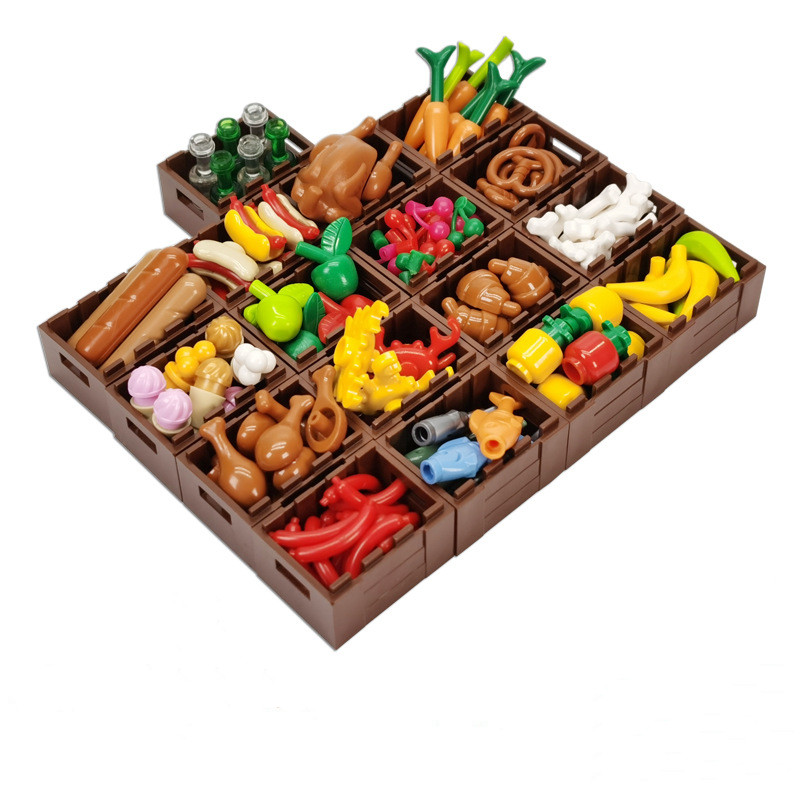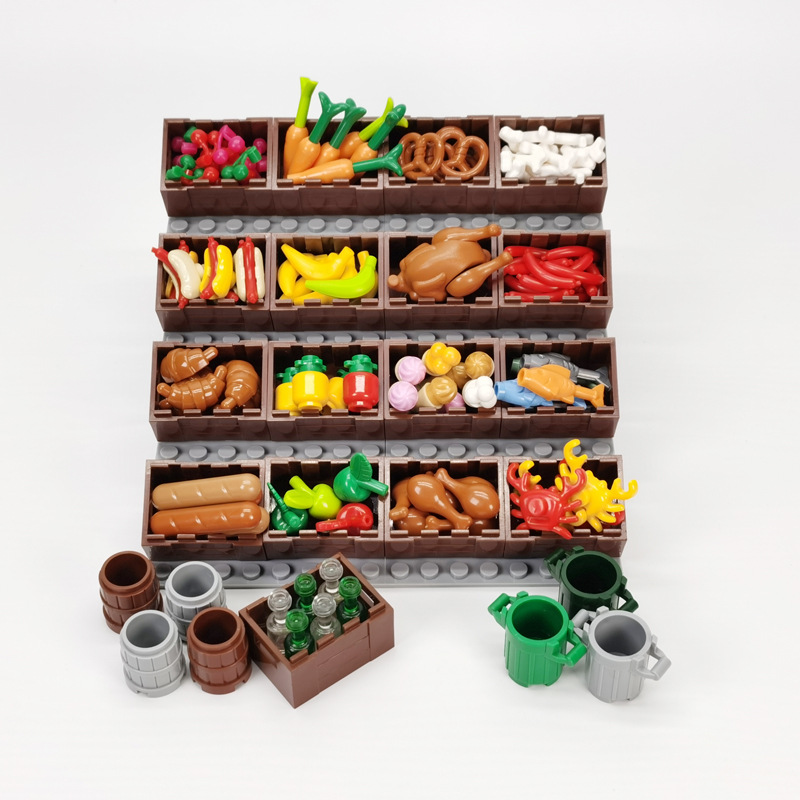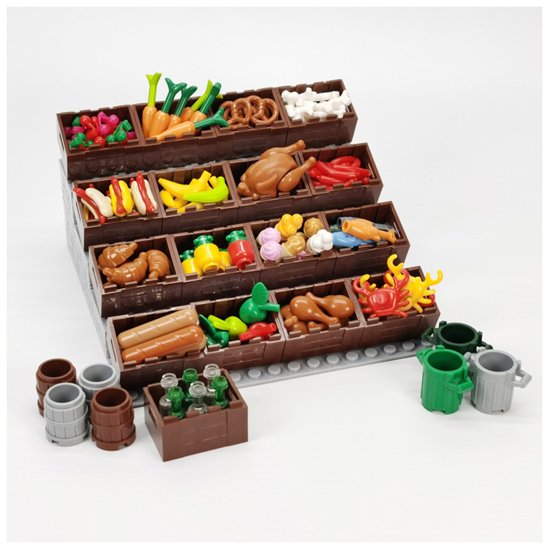 Color: A: A set of food display racks (including food). Random color, B: A set of food display racks (without food). C: 17 food baskets (including food). Random color, D: Lemon yellow, 1 set of food