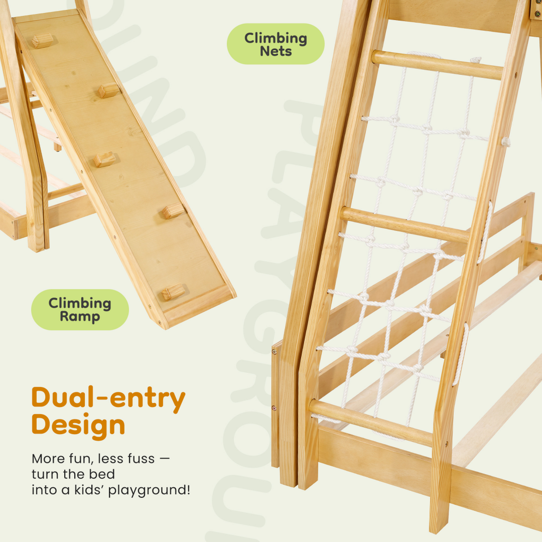 [Breathable & Natural Construction] The open climbing net design on this montessori bed promotes excellent air circulation, preventing the stuffiness of enclosed stairs. Crafted from high-quality solid wood, this kids twin bed frame offers a warm, natural feel that is much more inviting and comfortable for children than cold metal frames.