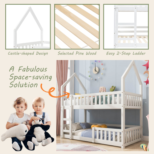 • Castle-shaped Bed with Ladder: The open top design expands the space for movement on the bed, so children don't have to worry about hitting their heads when they get up. The wooden bed in the form of a castle has a rounded top, a thoughtful design feature to safeguard kids.As a necessary configuration of this bunk bed, the ladder is indispensable. Two Steps are intended to make the climbing easier in this manner.