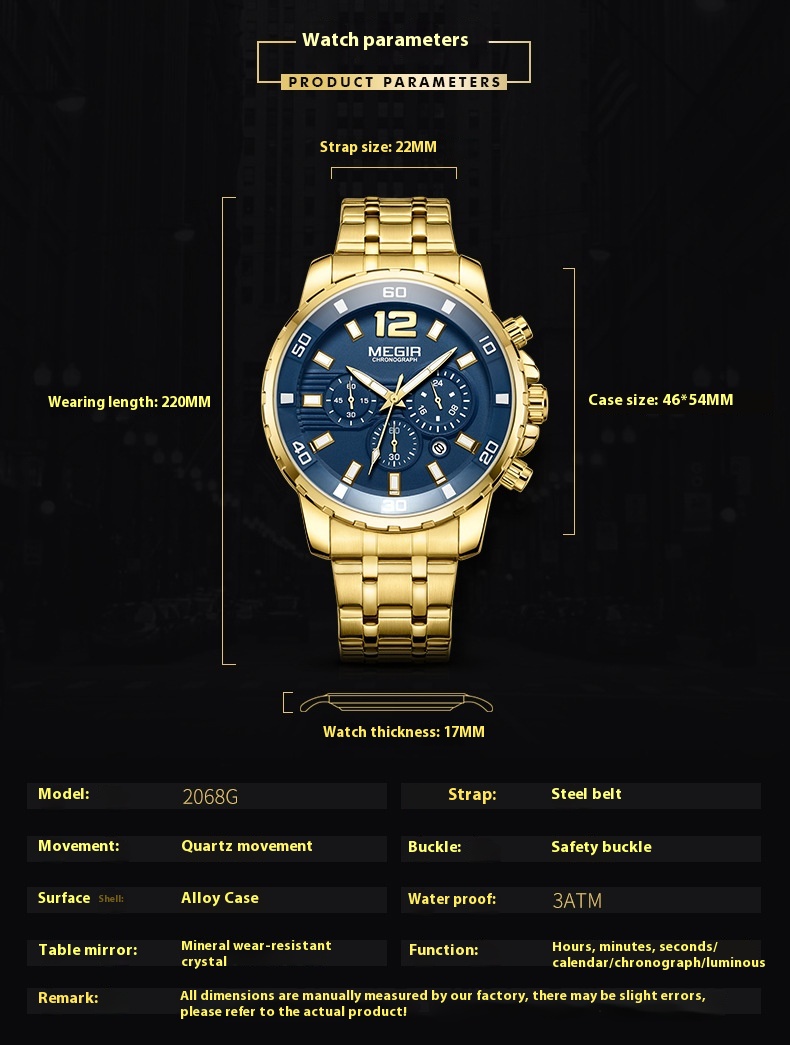 Color: blue surface gold strap, black surface steel belt, black surface black belt
