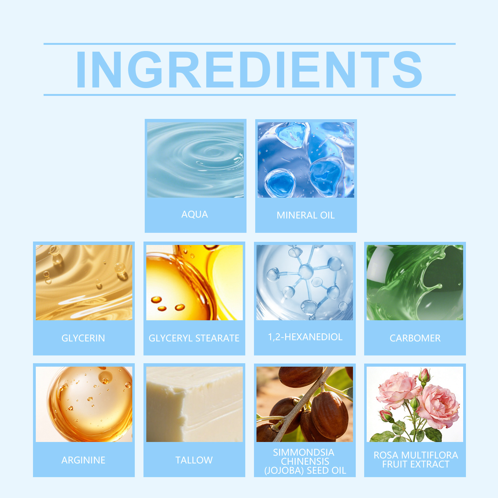 Ingredients: water, mineral oil, glycerin, glyceryl stearate, 1,2-hexanediol, carbomer, arginine, tallow, jojoba seed oil and Rosa davurica extract.