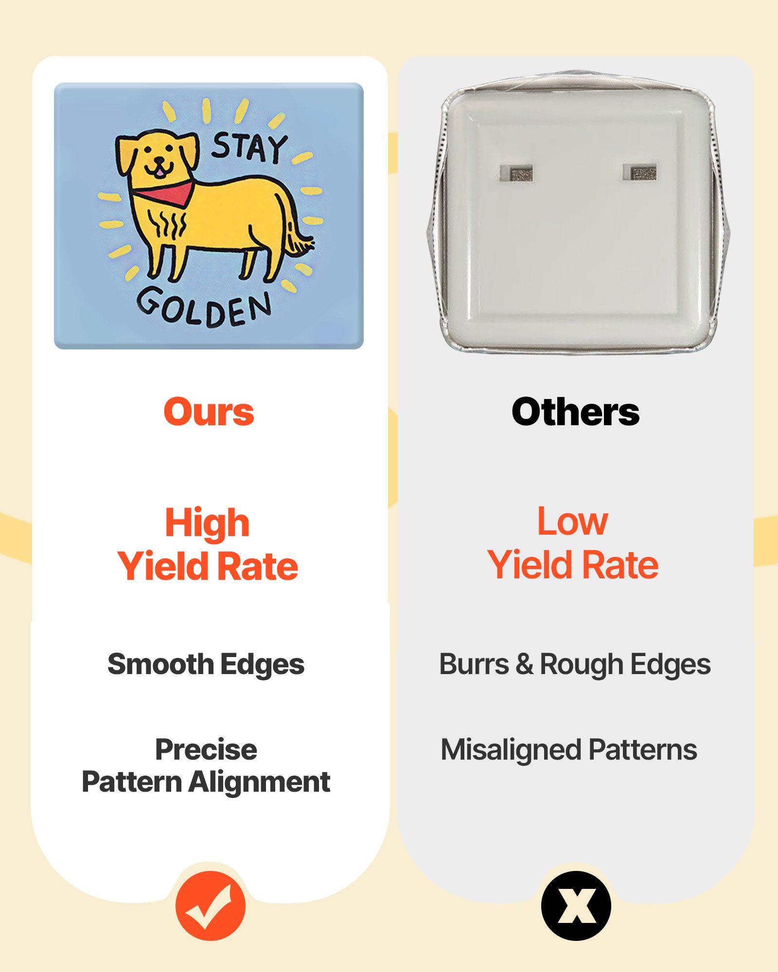 High Success Rate: Precision molds and alignment guides help avoid tilted designs, ensuring ideal outcomes every time. It is recommended to use 127-157g paper (135g performs especially well). Avoid mold shifting while using the button maker machine