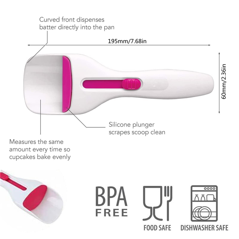 【Easy Operation】: After scooping up the batter, just slide the button to push it out and put it into the mold. The non-stick surface ensures that the batter flows smoothly and is scooped out. The spoon supports the batter to reduce the chance of the batter spilling or splattering when poured into the pan.