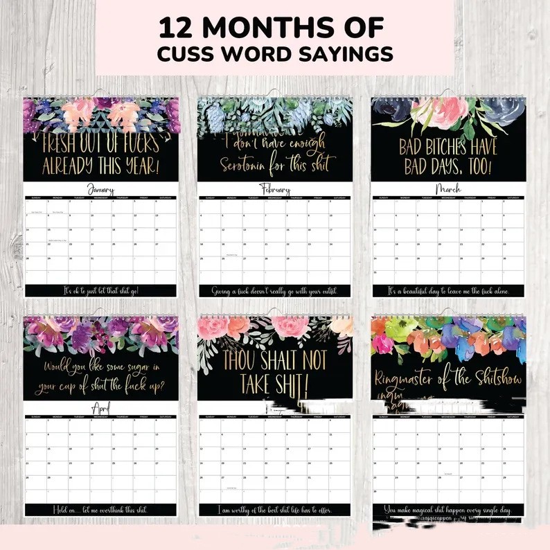 Each month features a two-page calendar with tons of space to keep track of events, holidays, appointments, birthdays, etc..... plus funny and sweary sayings each month!