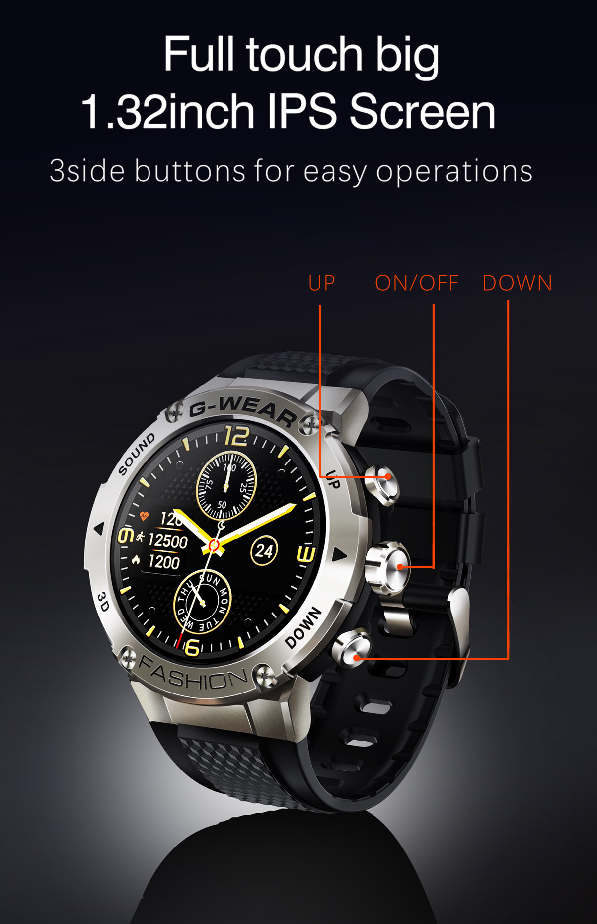 Functions: Waterproof, audio and video entertainment, photo taking, step counting, heart rate monitoring, blood pressure measurement, social entertainment, Bluetooth call, smart reminder, remote control selfie, sleep monitoring, blood oxygen detection, information push