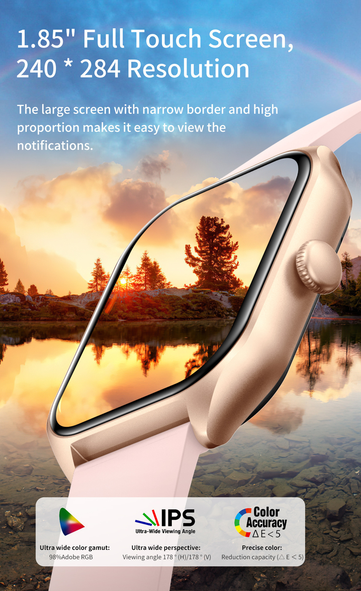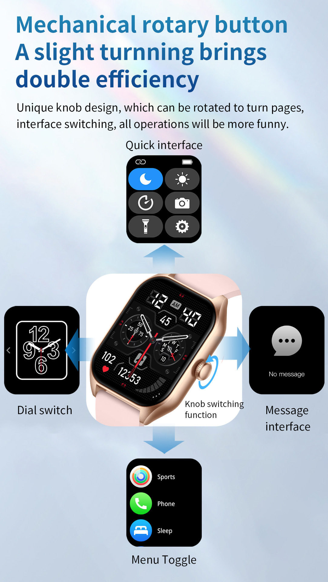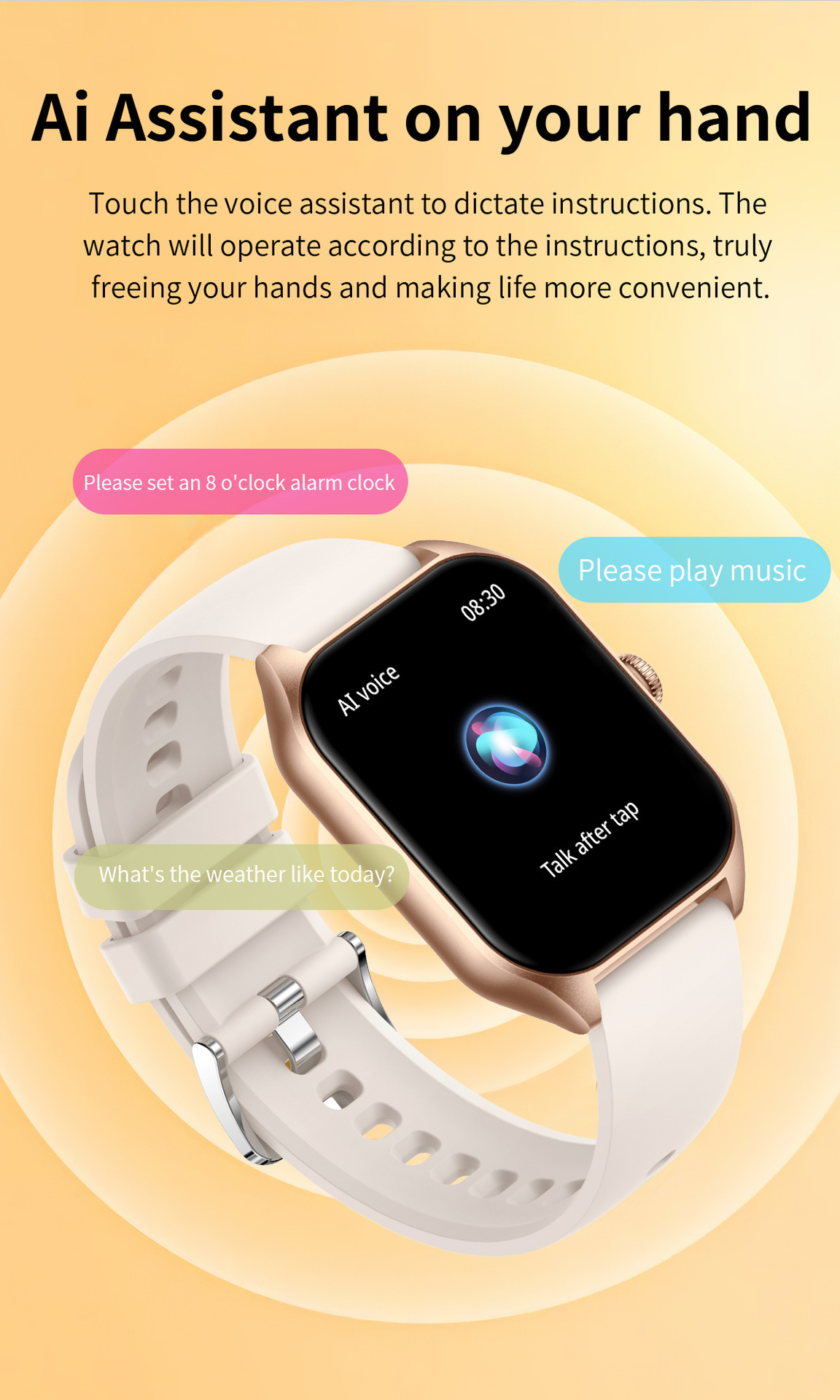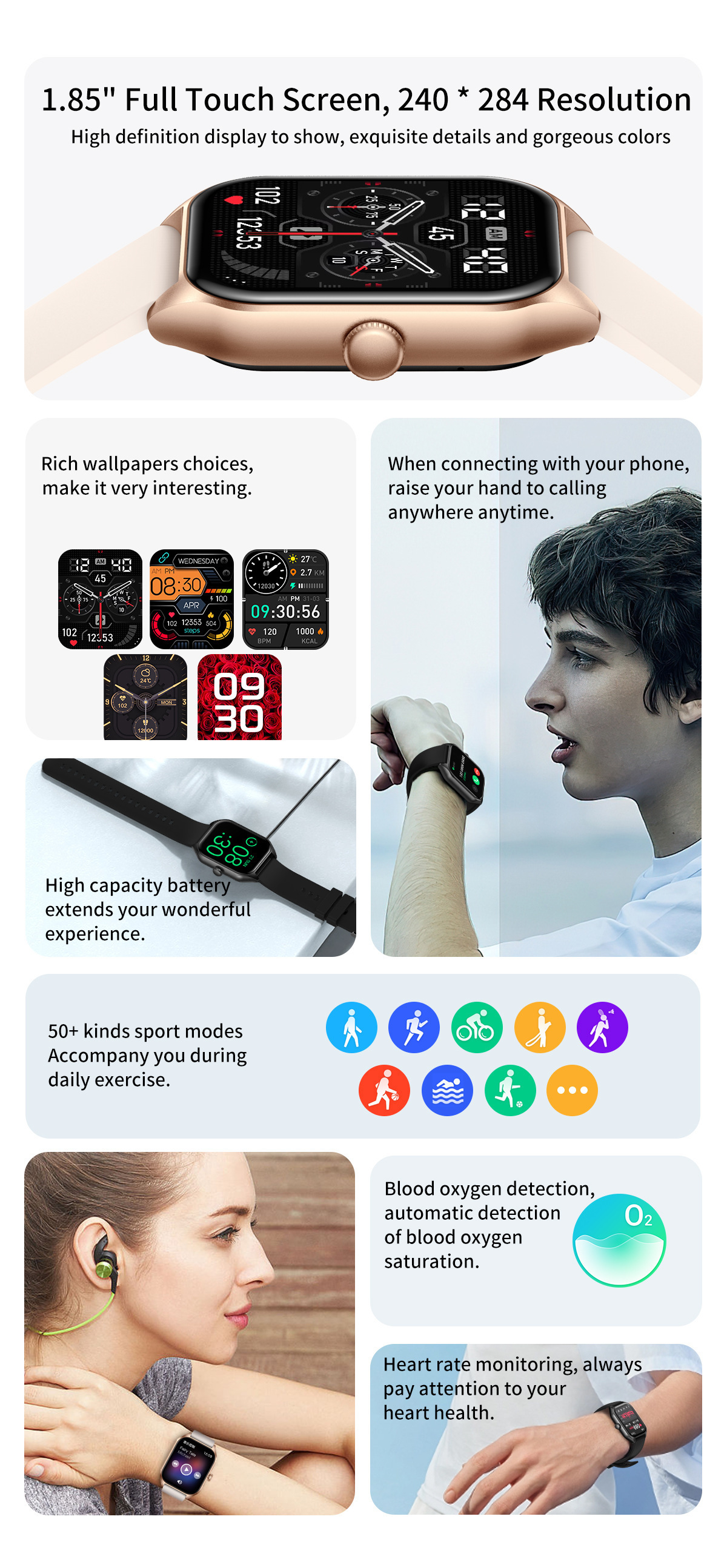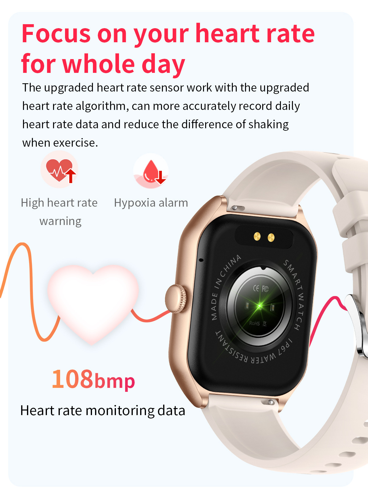 Functions: step counting, heart rate monitoring, blood pressure measurement, Bluetooth calling, smart reminder, sleep monitoring, blood oxygen detection