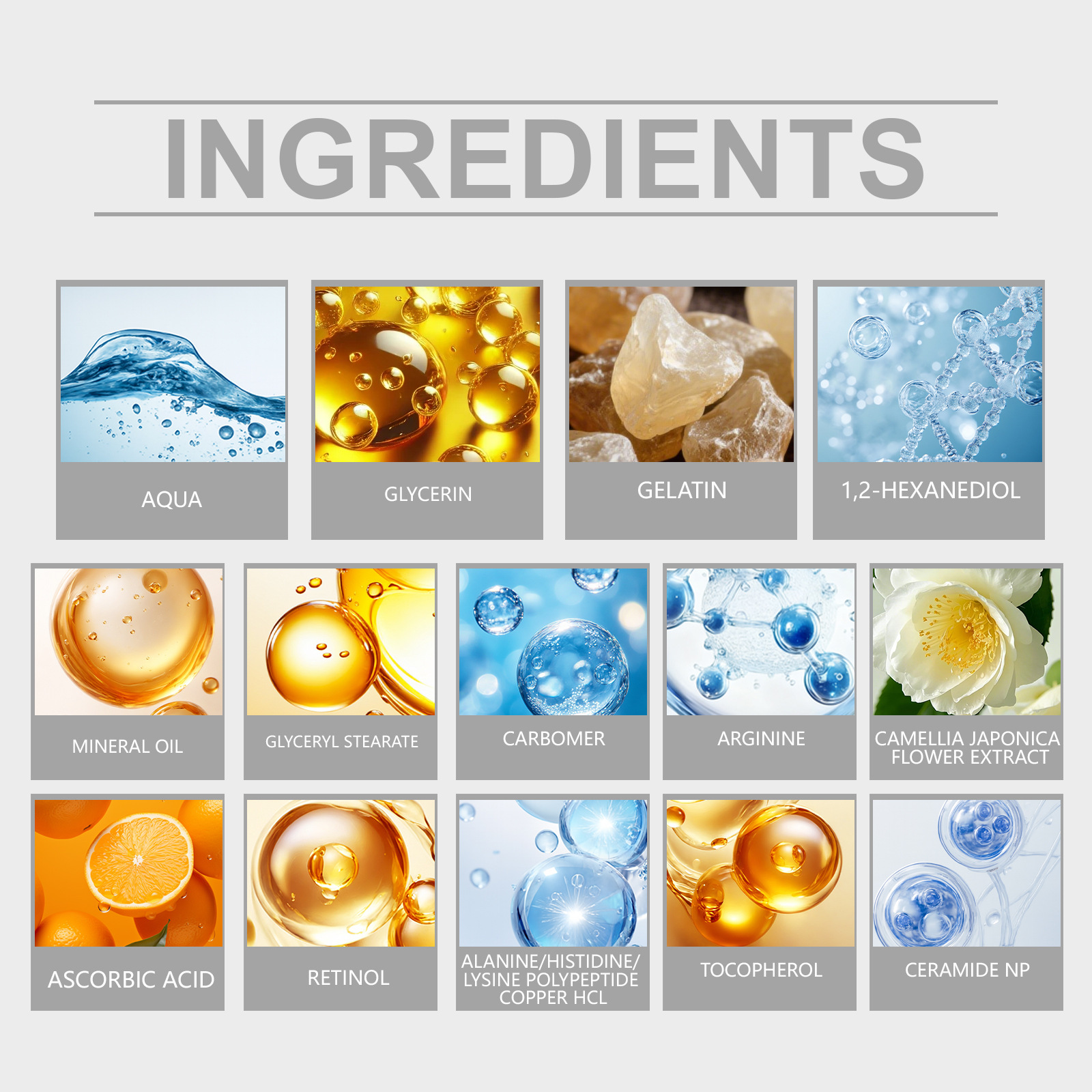 Ingredients: water, glycerin, gelatin, 1,2-hexanediol, mineral oil, glyceryl stearate, carbomer, arginine, camellia extract, ascorbic acid (vitamin C), retinol, copper hydrochloride of alanine/histidine/lysine polypeptide, tocopherol (vitamin E), ceramide NP.