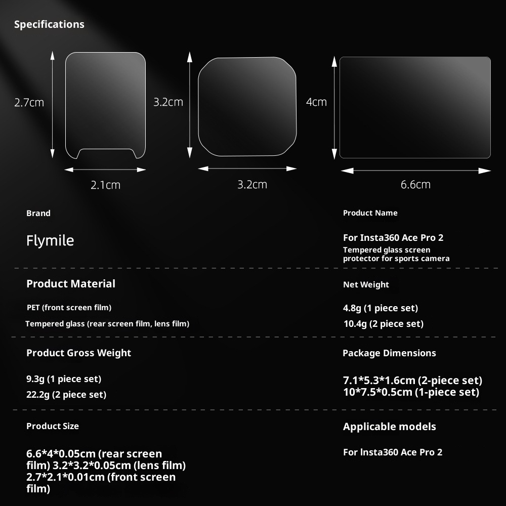 Package List: front screen protector x 1, rear screen protector x 1, lens protector x 1, alcohol pad x 1, cleaning cloth x 1, dust sticker x 1