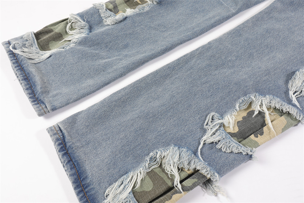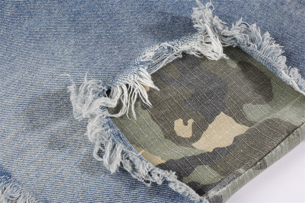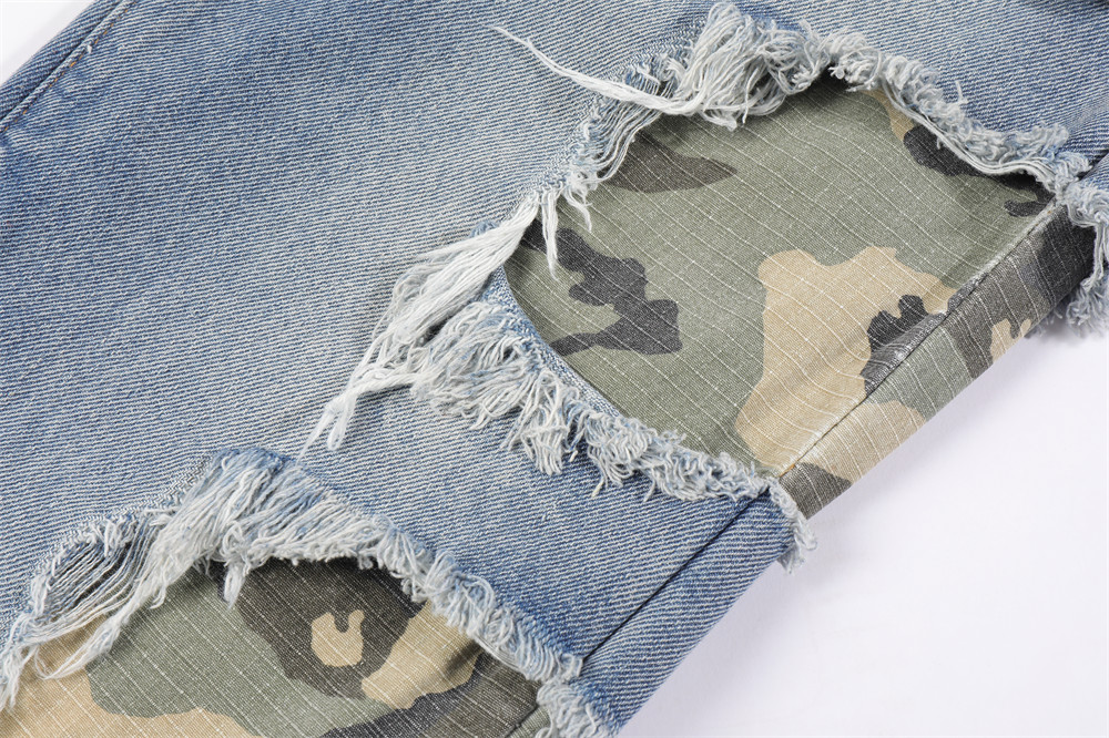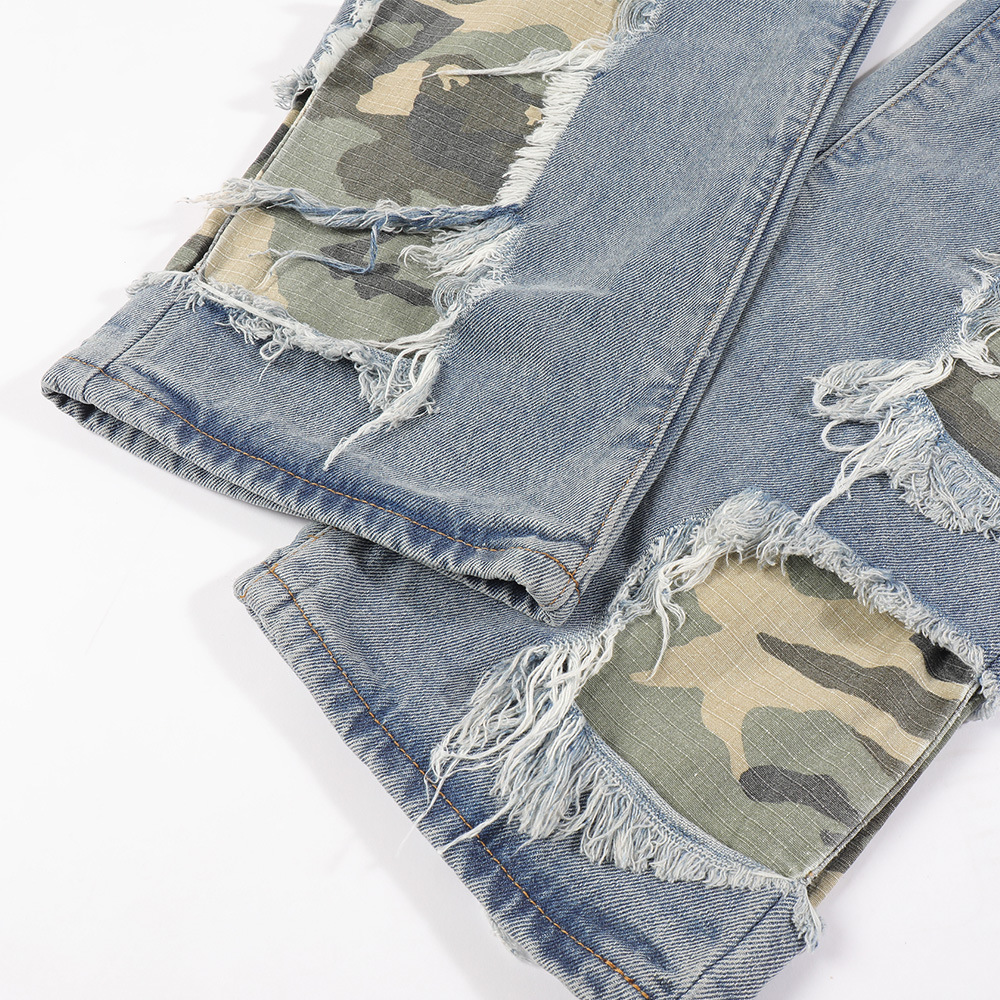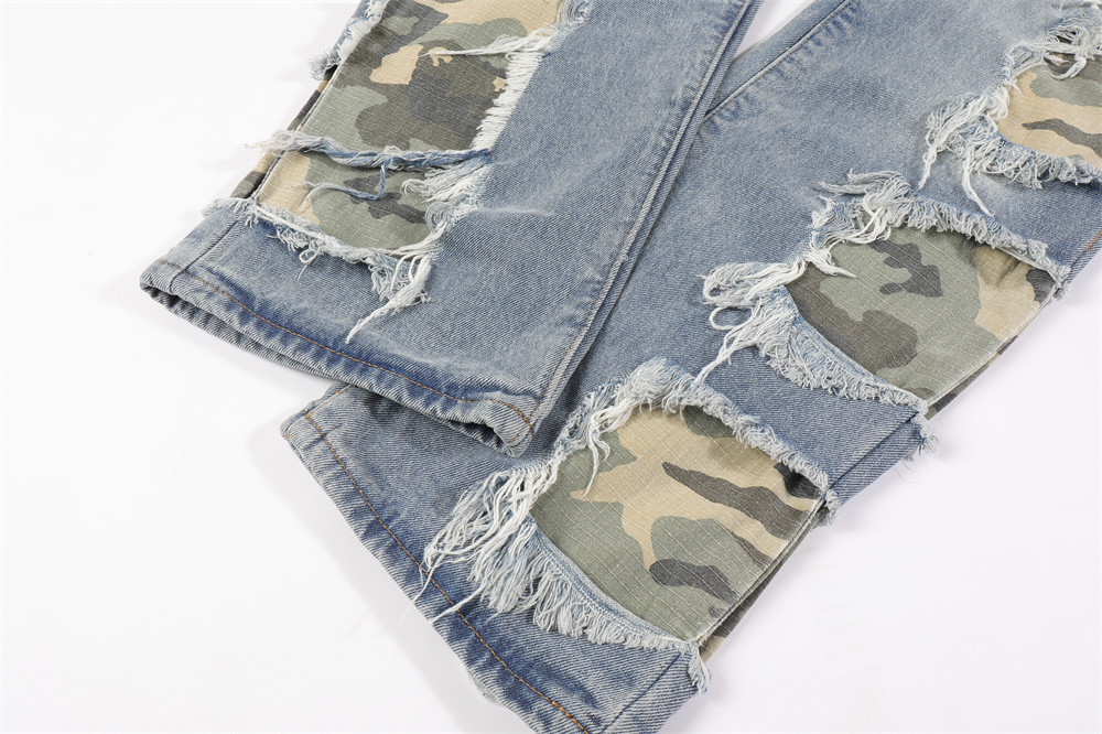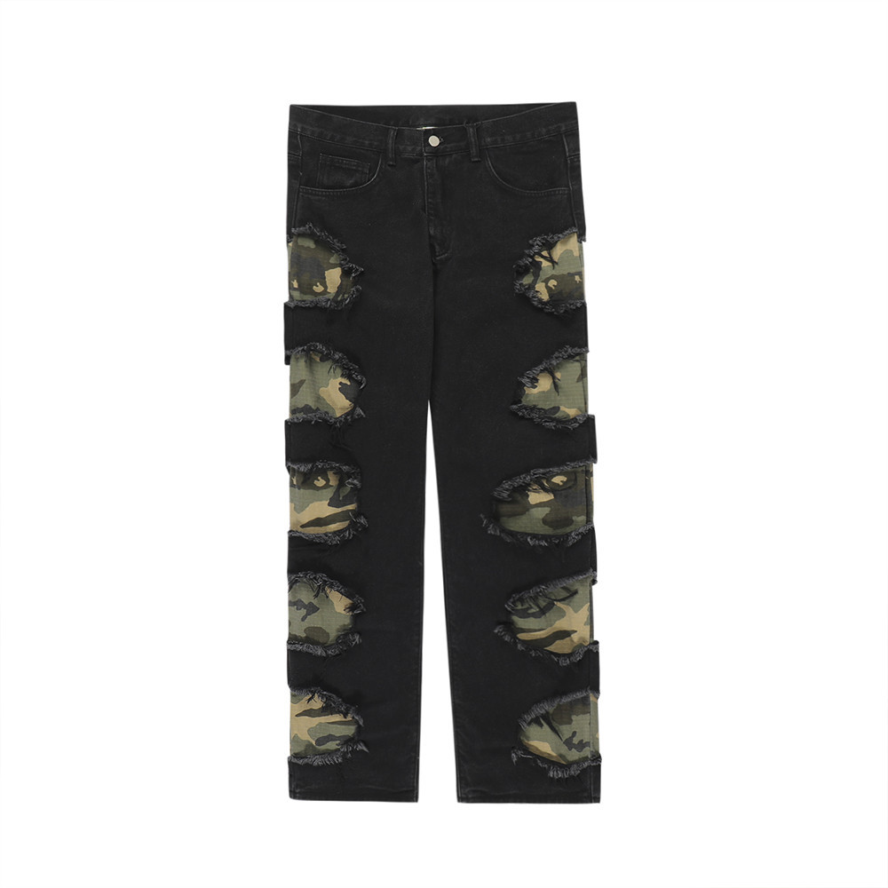 Camo Ripped Tape Jeans Men's Patchwork Tassel Straight Pants